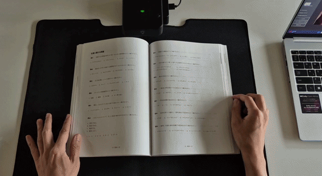 厚い本を開いたときにできる中央の歪みを瞬時に認識し、平らな紙のように補正します。また、ページを押さえる指をAIが識別して自動で消去するため、大切な本を裁断することなく、自然で美しい仕上がりを実現します。