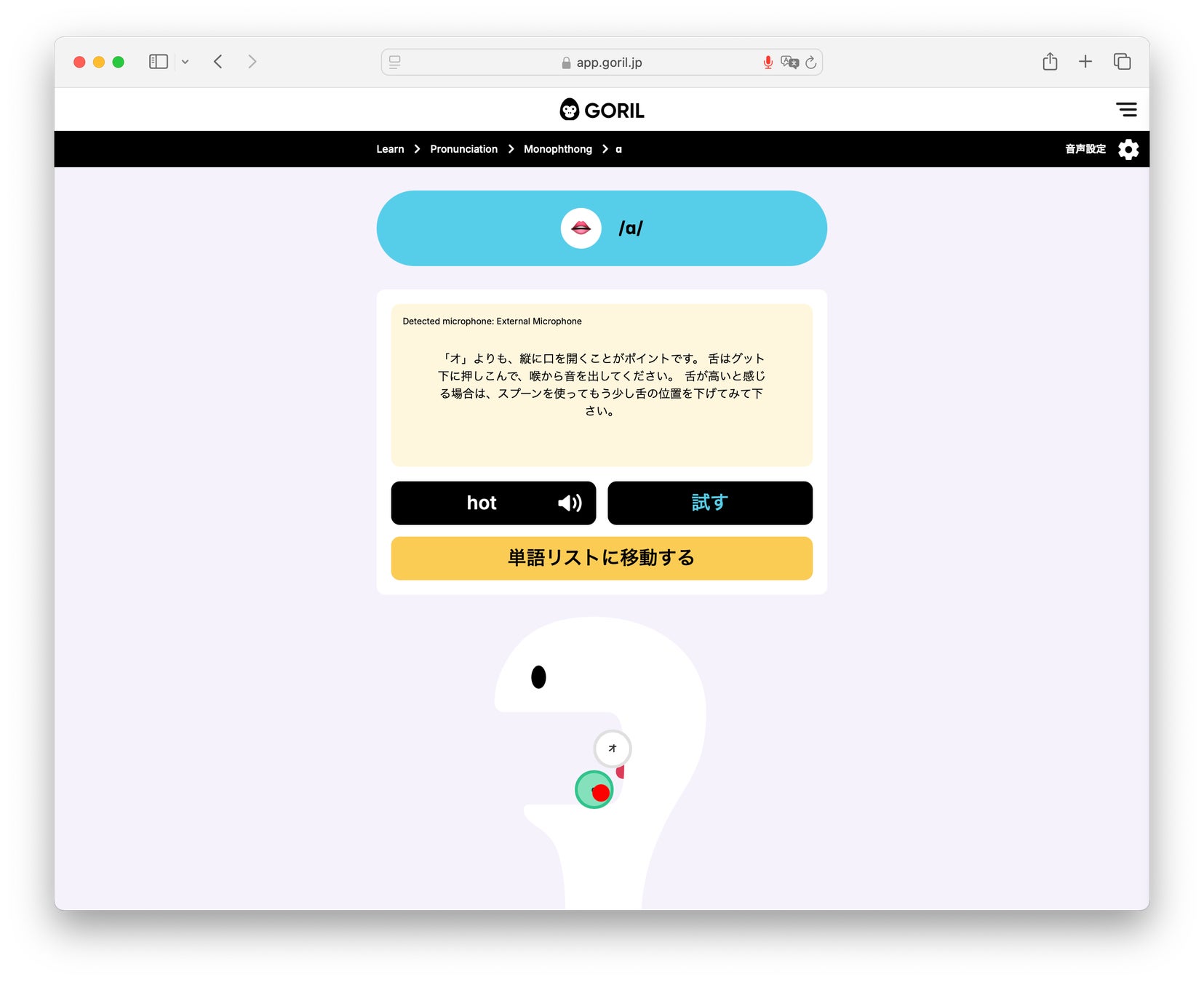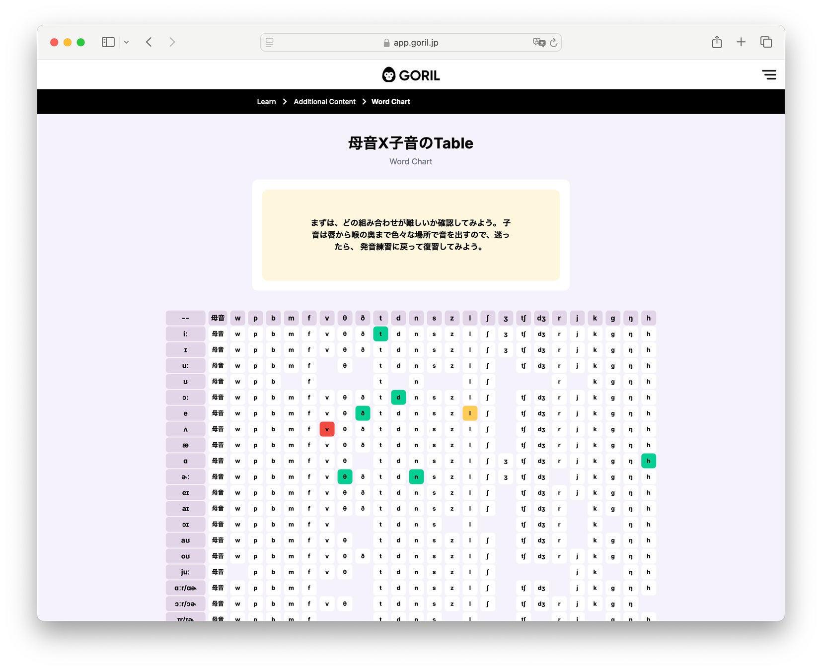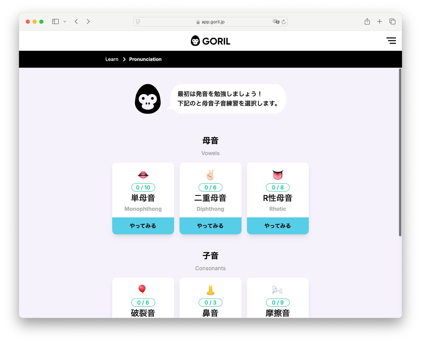 「GORIL」は、語+ドリルから名付けられた、どんな人でも、楽しく使える全く新しいタイプの発音学習ツールです。音声を科学的に分析し、可視化して、再現可能な一種の運動とすることで、楽しく発音を身に着けることができるツールです。