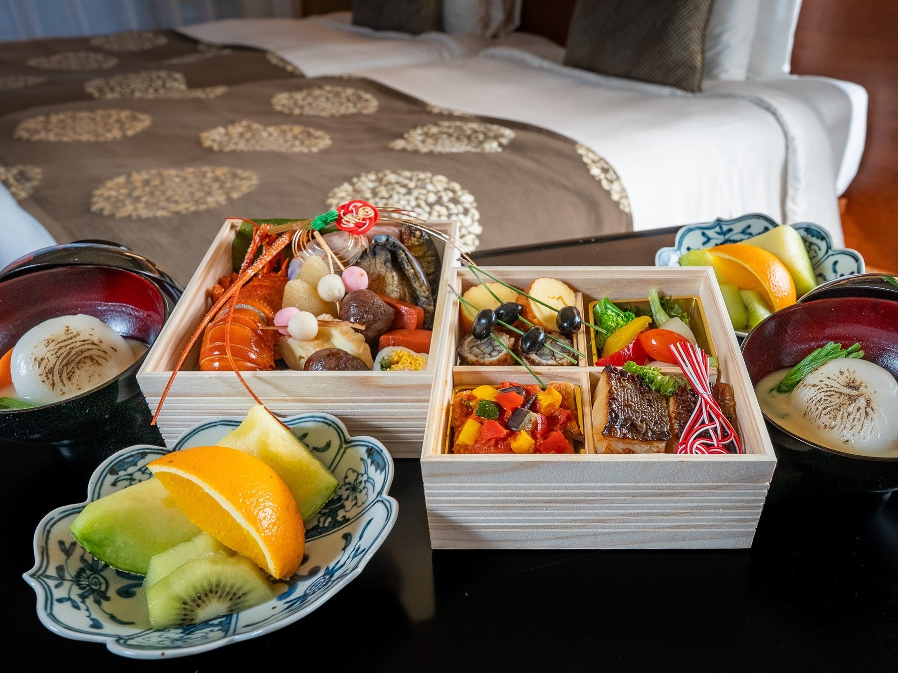 鮑の旨煮や伊勢海老のあられ揚げ、甘鯛・まながつおの味噌焼きなど、縁起の良い食材を贅沢に盛り込みました。温かな白味噌仕立ての京雑煮とともに、客室で心安らぐ新年の朝をお迎えください。