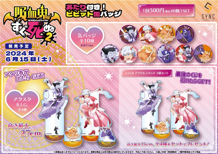 キャラクターグッズの企画・製造・販売を手がけるシンクイノベーション株式会社(代表取締役:三輪直之、本社:愛知県名古屋市)が、『吸血鬼すぐ死ぬ2』の【あたり付き!ビビット缶バッジ】を2024年6月15日(土)より発売予定!