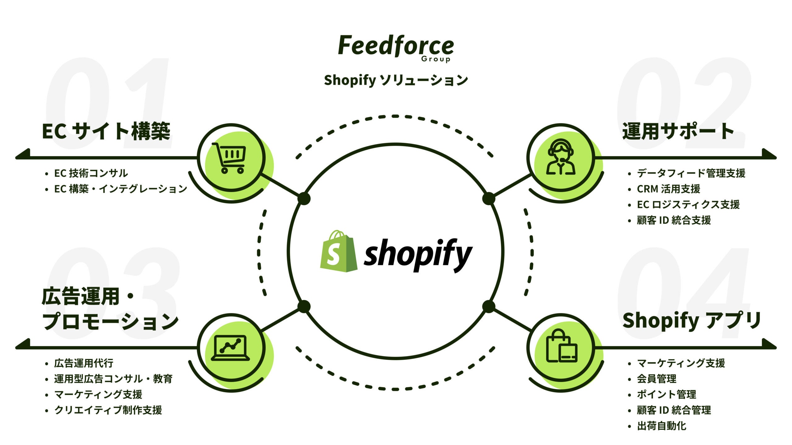 フィードフォースグループは、Shopifyが世界に広げるエコシステムの中で、デジタルマーケティングやCRM活用支援、EC出荷業務の自動化など、幅広いサービスを提供し、Shopifyストアの運営と事業成長をサポートしています。