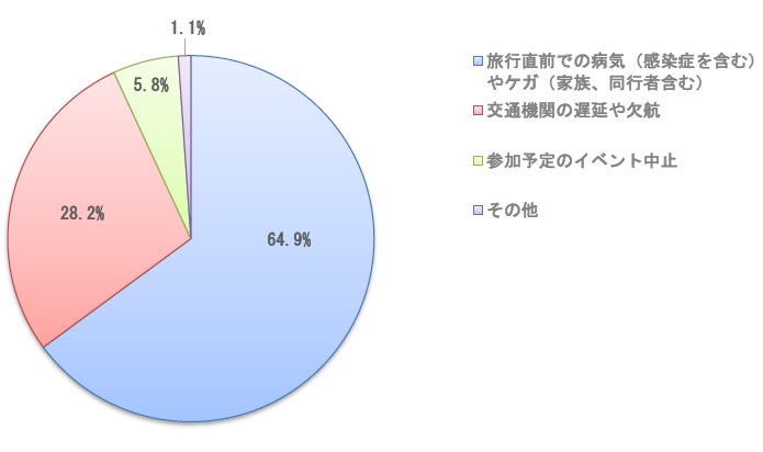 ・「旅行直前での病気やケガ」という回答が6割を超え、自身や家族の健康状態がキャンセルの理由になる可能性が最も高いことがわかりました。 ・その他の理由としては、「仕事」や「旅行先の新型コロナウイルス感染症の状況」などがありました。 |
