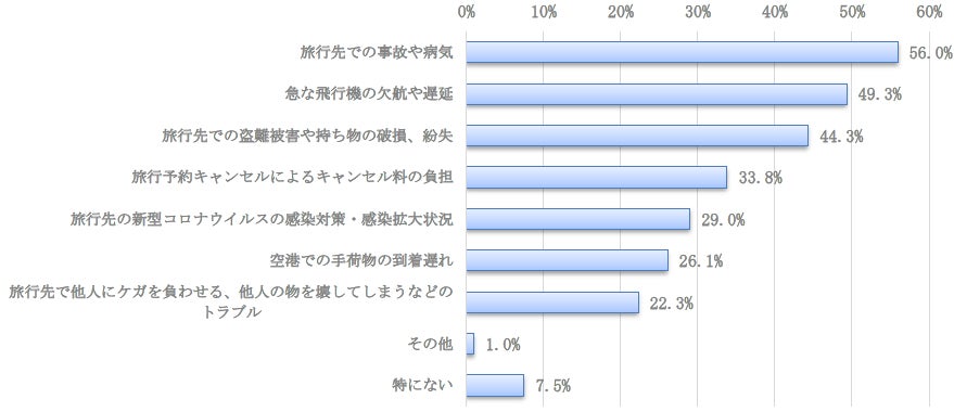 ・「空港での手荷物の到着遅れ」(28.4%)が最も多く、「急な飛行機の欠航や遅延」(27.1%)、「旅行先での持ち物の破損・紛失」(26.6%)と続きました。 ・その他、「観光地の訪問制限」、「自然災害」、「強盗などの犯罪被害」といった意見もありました。 |