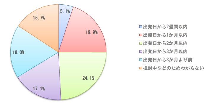・「出発日から2か月以内」という回答が24.1%と最も多く、「出発日から3か月以内」が17.1%、「出発日から3か月より前」が18.0%と、時間的な余裕をもって予約する方が多いことがわかりました。 ・「出発日から1か月以内」が19.9%、「出発日から2週間以内」も5.1%で、旅行直前で予約する方も一定数いることがわかりました。 |