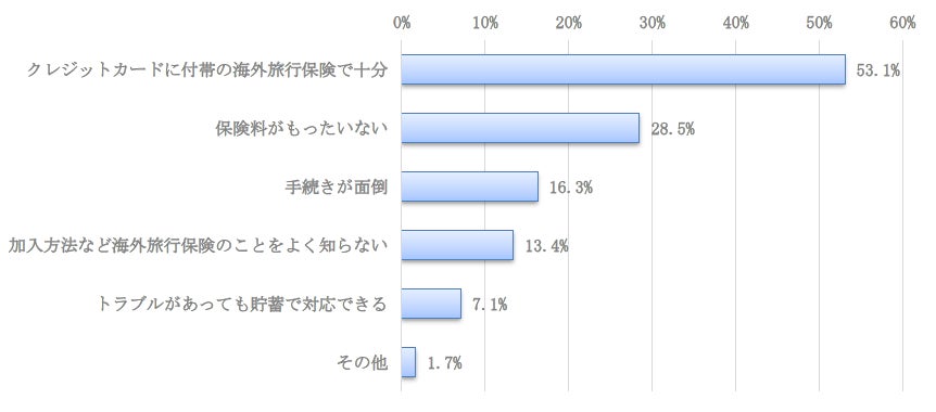 ・「クレジットカードに付帯の海外旅行保険で十分」(53.1%)、「保険料がもったいない」(28.5%)という回答が多かったことから、なるべく出費を抑えたいという方が多いことが推察されます。 |