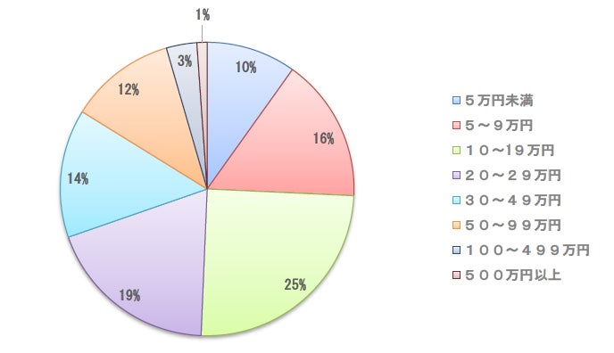・10~19万円と回答する方が25%と最も多く、20~29万円が19%、5~9万円が16%と続きました。また、7割の方が29万円以下の回答でした。 |