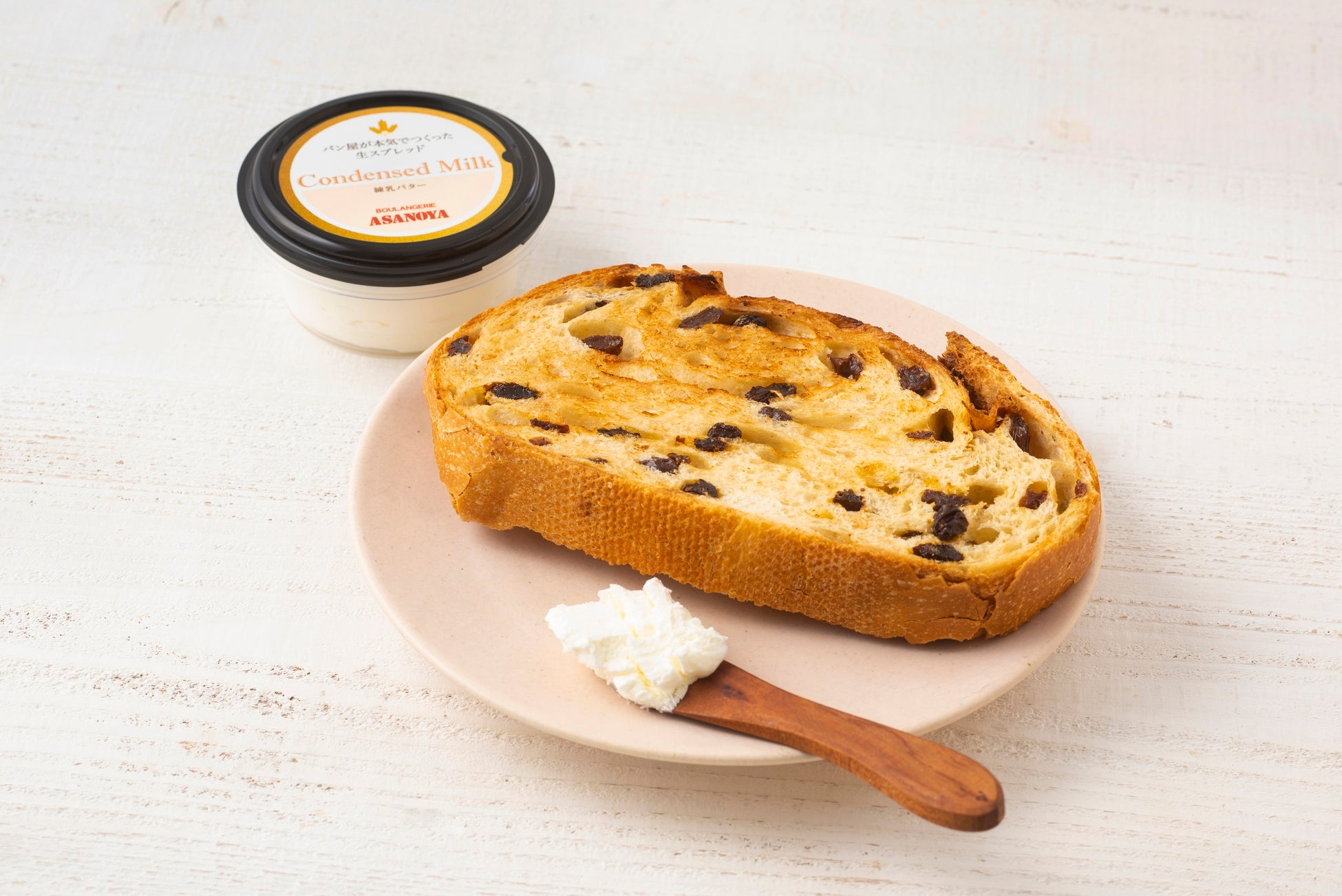 ラムレーズンをたっぷり配合した柔らかい生地をカリっと芳ばしいフランスパン生地で包み、焼き上げた浅野屋オリジナルの人気商品です。トーストしてバタークリームをのせると、塩味と甘味の絶妙なコンビネーションが楽しめます。