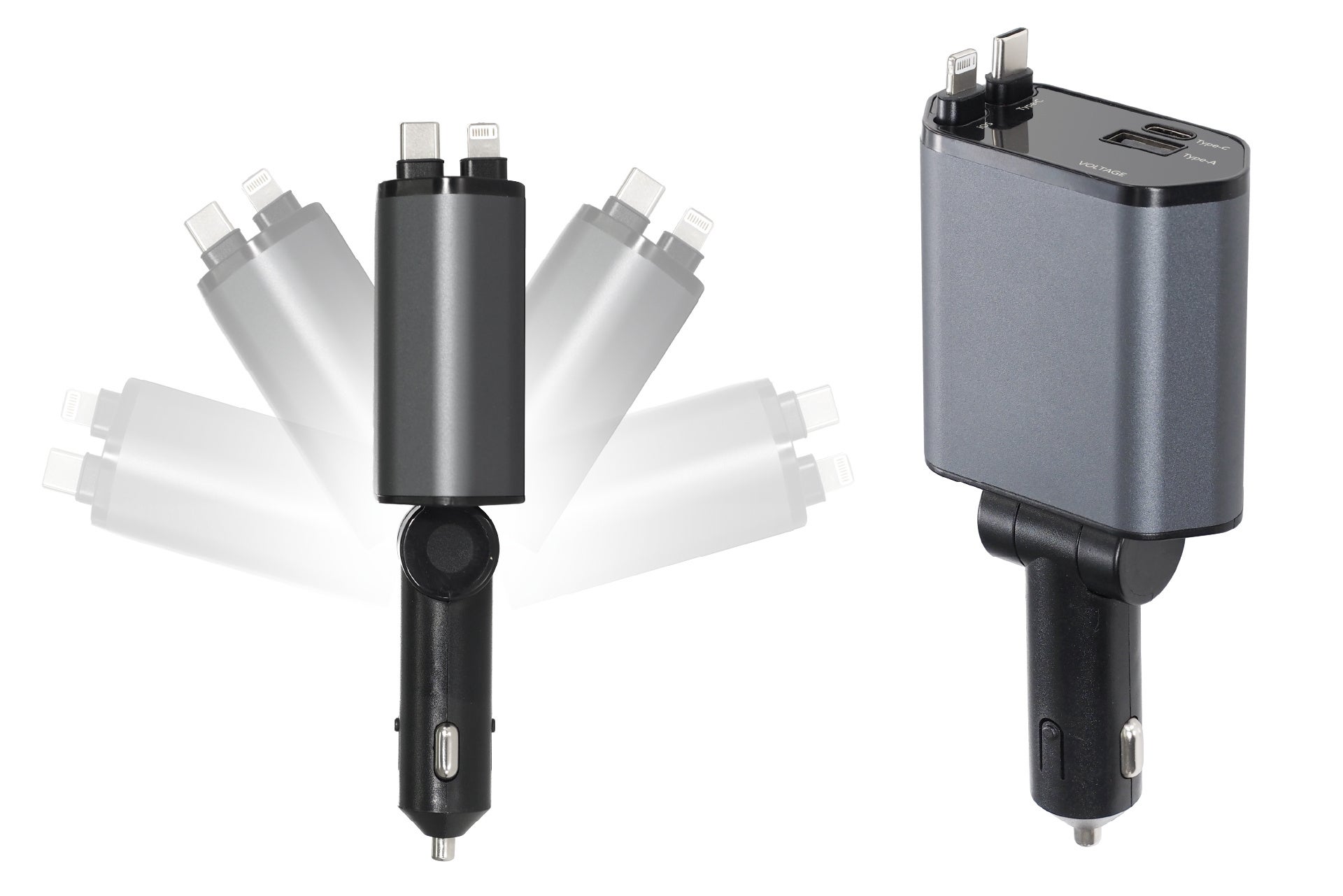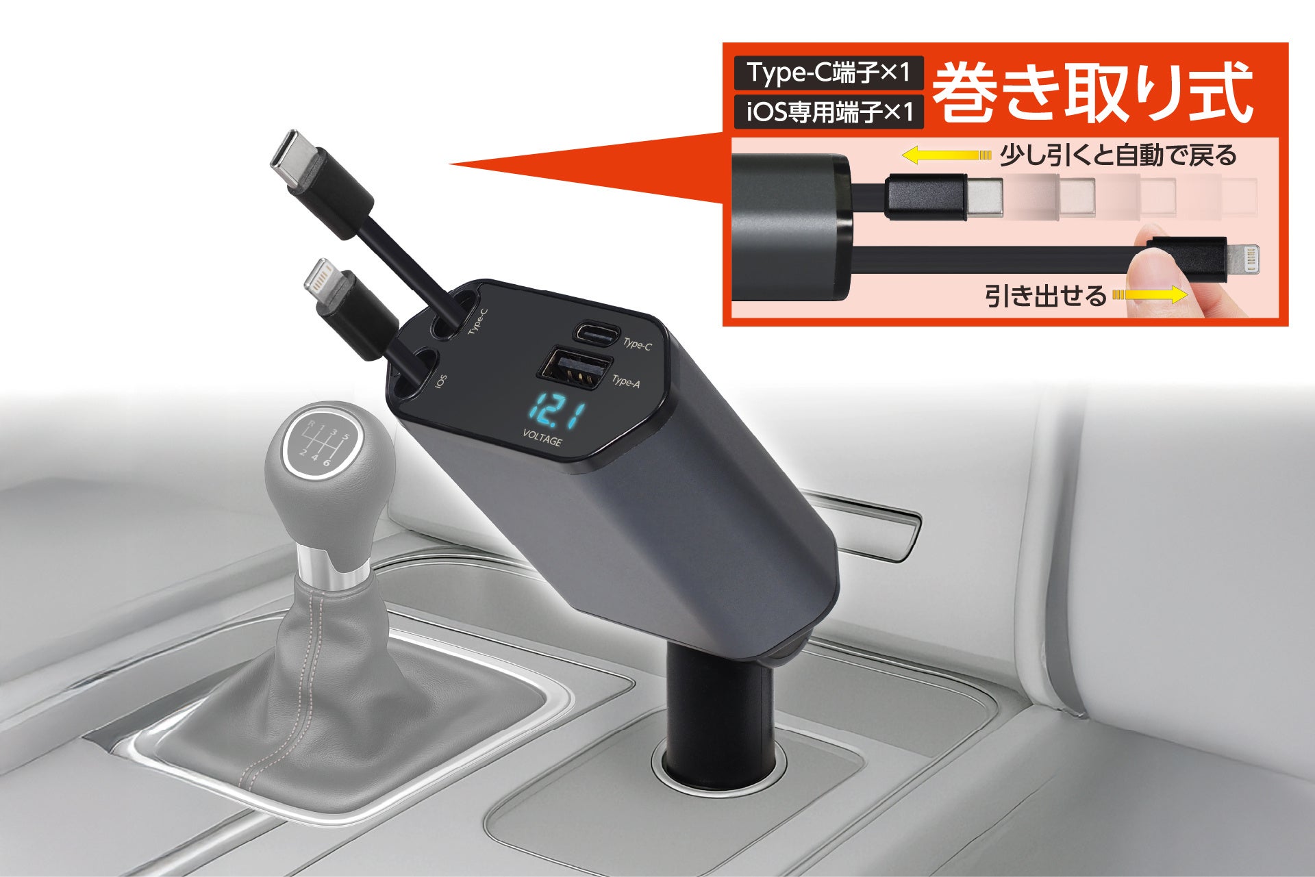 特徴:少し引くと自動で戻る!とっても便利な巻き取り式カーチャージャー!「type-A・type-C×2・iOS端子」を備えて4台同時充電可能!車のバッテリー電圧表示付きでバッテリー交換時期を常時チェックできます。支柱から約170°前後回転でき好きな角度に調節できます。あると便利なチャージャーをスマートに備えよう!