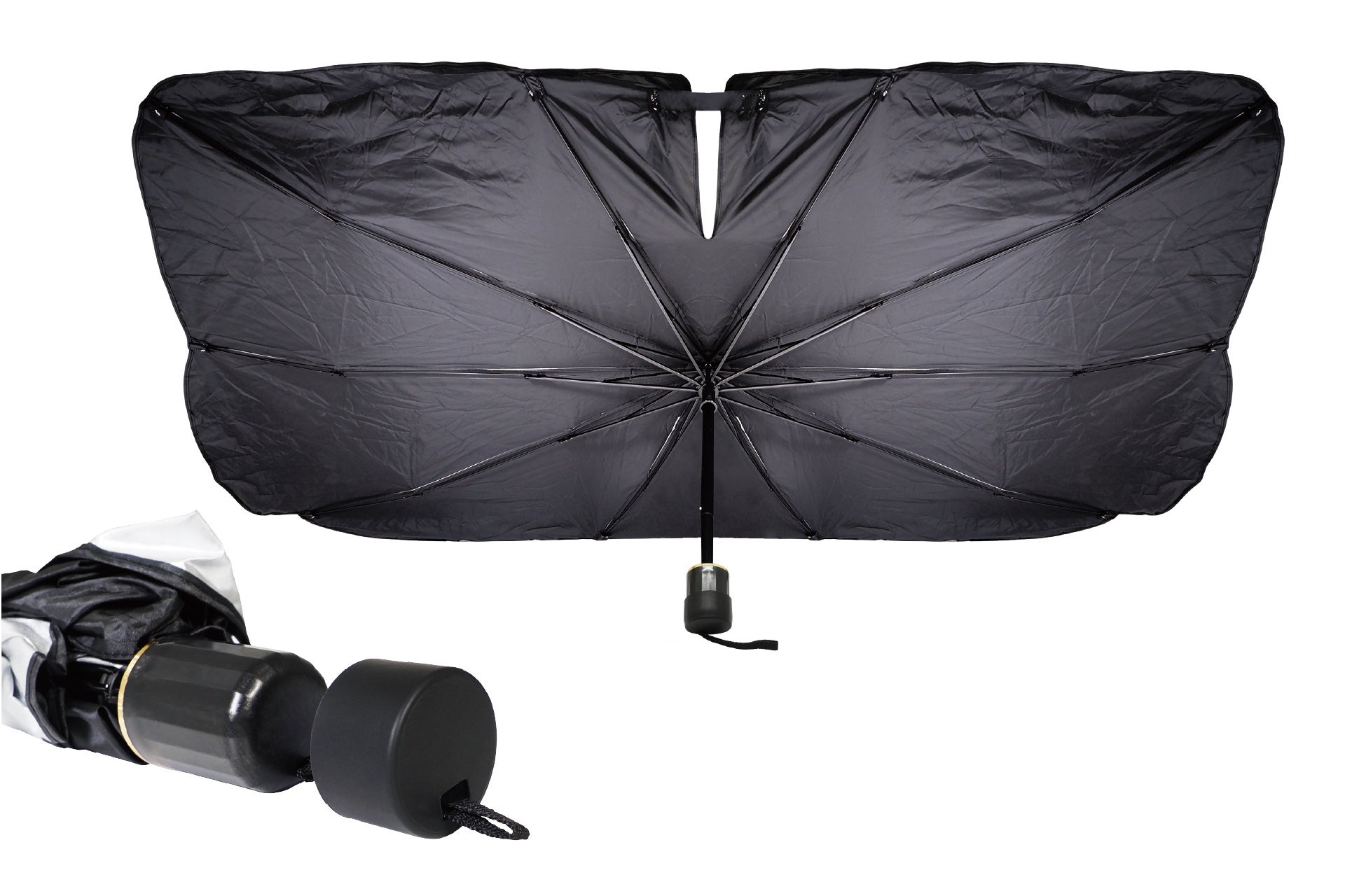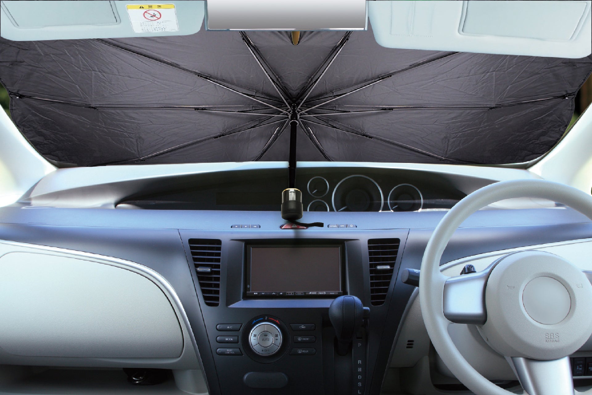 特徴:傷防止シリコンキャップ付きの傘型サンシェード登場!シリコンキャップで車内を傷つける心配がありません。傘のように「パッ」と開いて熱や紫外線99.5%以上カット!普通車・ミニバン/軽自動車タイプのフロントガラスのサイズをカバーできます。PUレザー仕様の専用収納袋付きで収納もコンパクトに。車内温度の上昇防止や仮眠時の目隠しにおススメです。丈夫な10本傘骨なので耐久性もバッチリ!