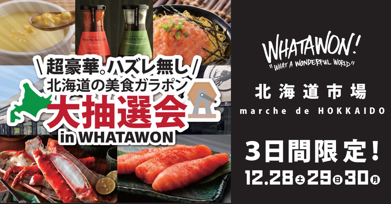 株式会社antiqua(本社:大阪府和泉市)が手がける南大阪のエンターテインメントモールWHATAWON(ワタワン)内の『北海道市場 marche de HOKKAIDO』にて「北海道の美食ガラポン大抽選会」を12月28日(土)から30日(月)までの3日間限定で開催いたします。