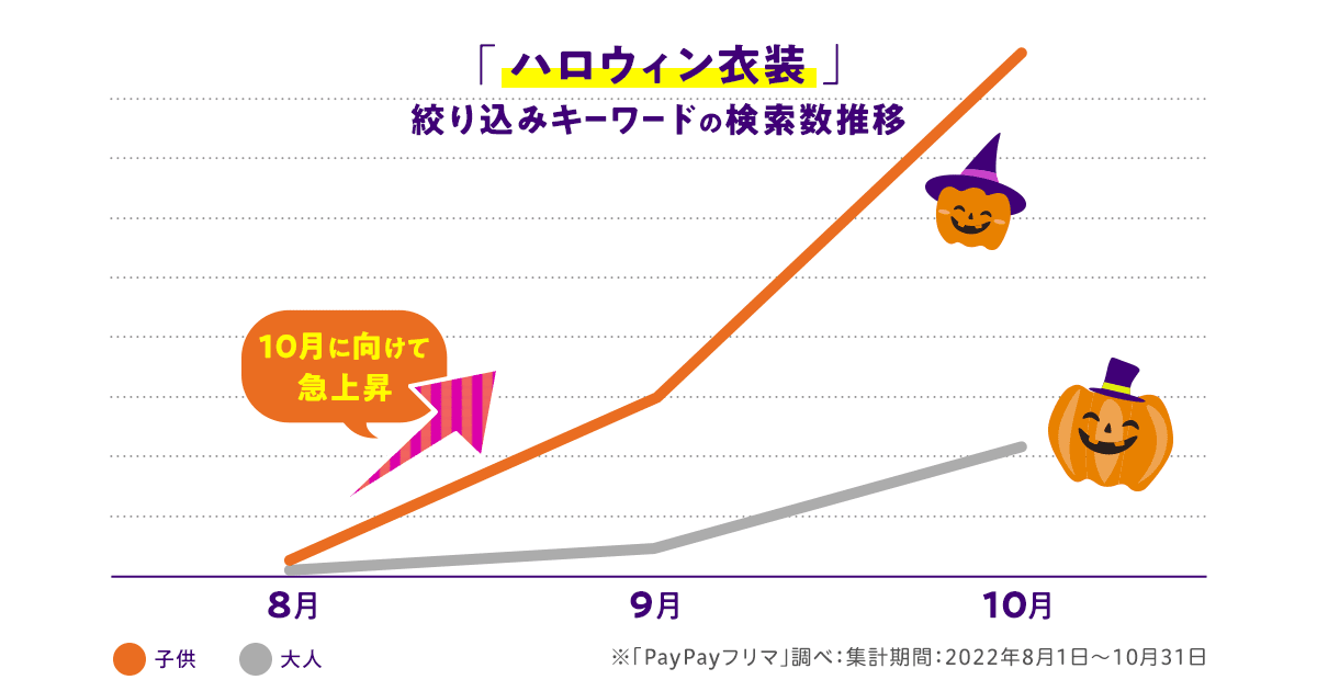 「PayPayフリマ」では、8月頃からハロウィンに向けて「ハロウィン衣装」の検索数が増えてきます。2022年の検索データでは、「ハロウィン衣装」と併せて検索されたキーワードには、"大人"や"子供"など着用する対象を絞り込むような文字が目立ちました。