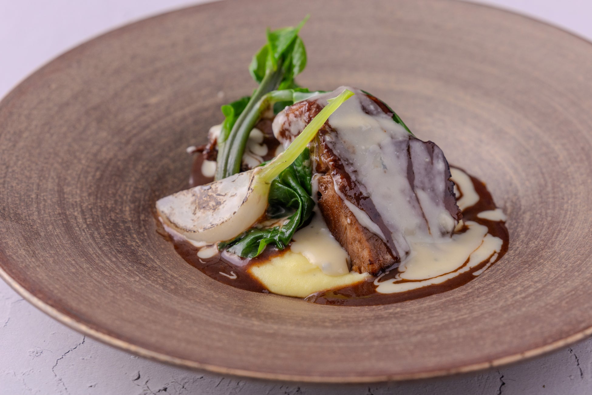 三元豚肩ロース肉の赤ワイン煮込み ゴルゴンゾーラクリームソース