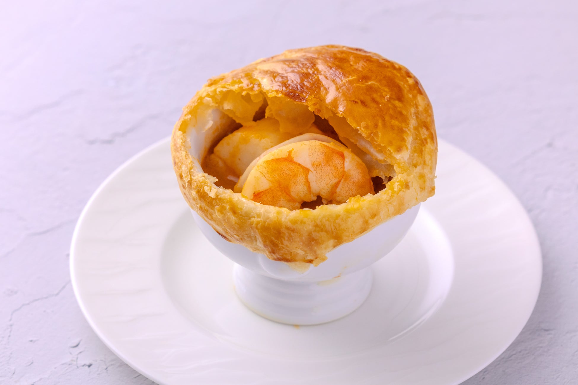 エビやホタテ、アンコウの身がごろっと入ったブイヤベースです。サクサクのパイを崩して一緒にお召し上がりください。