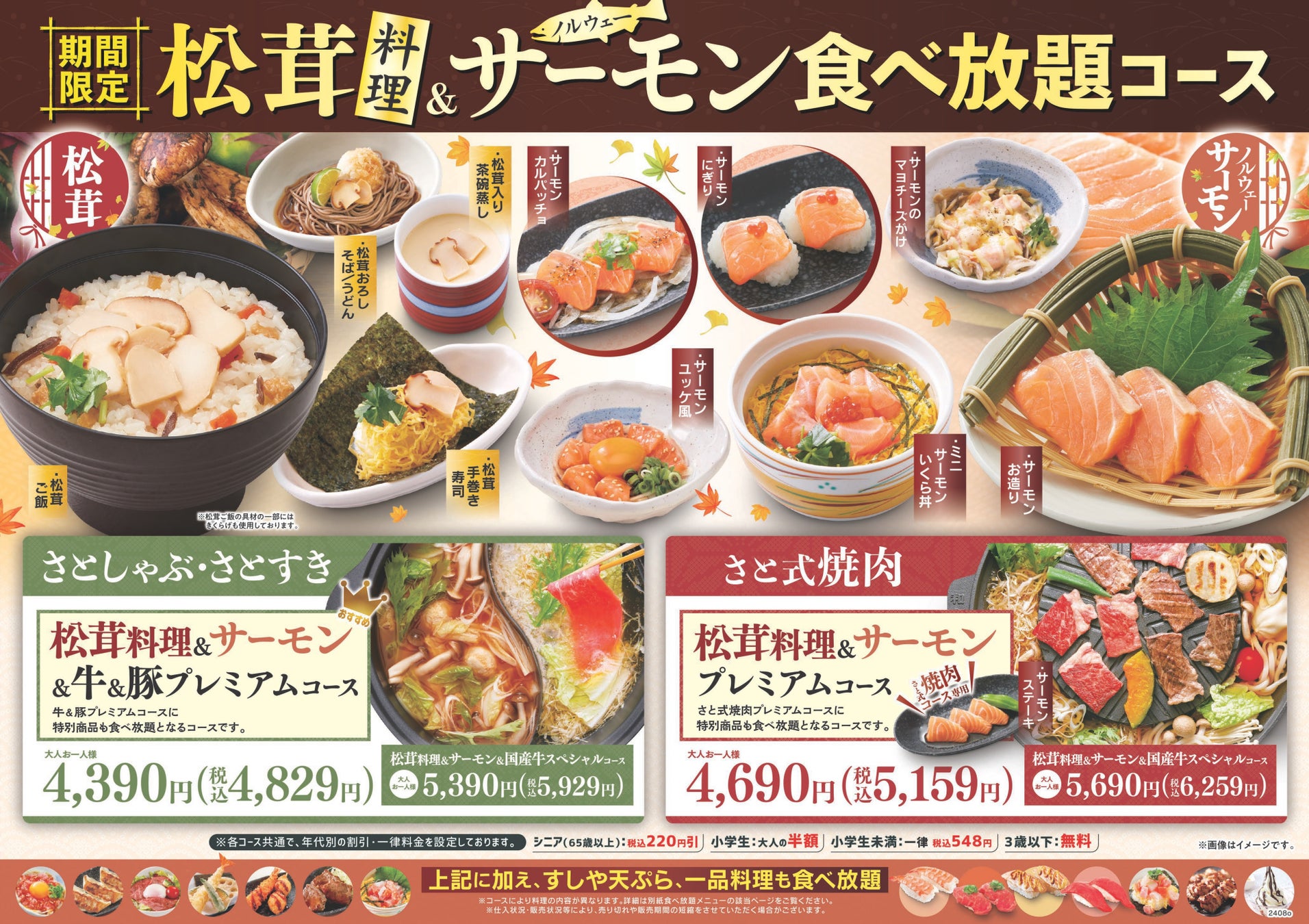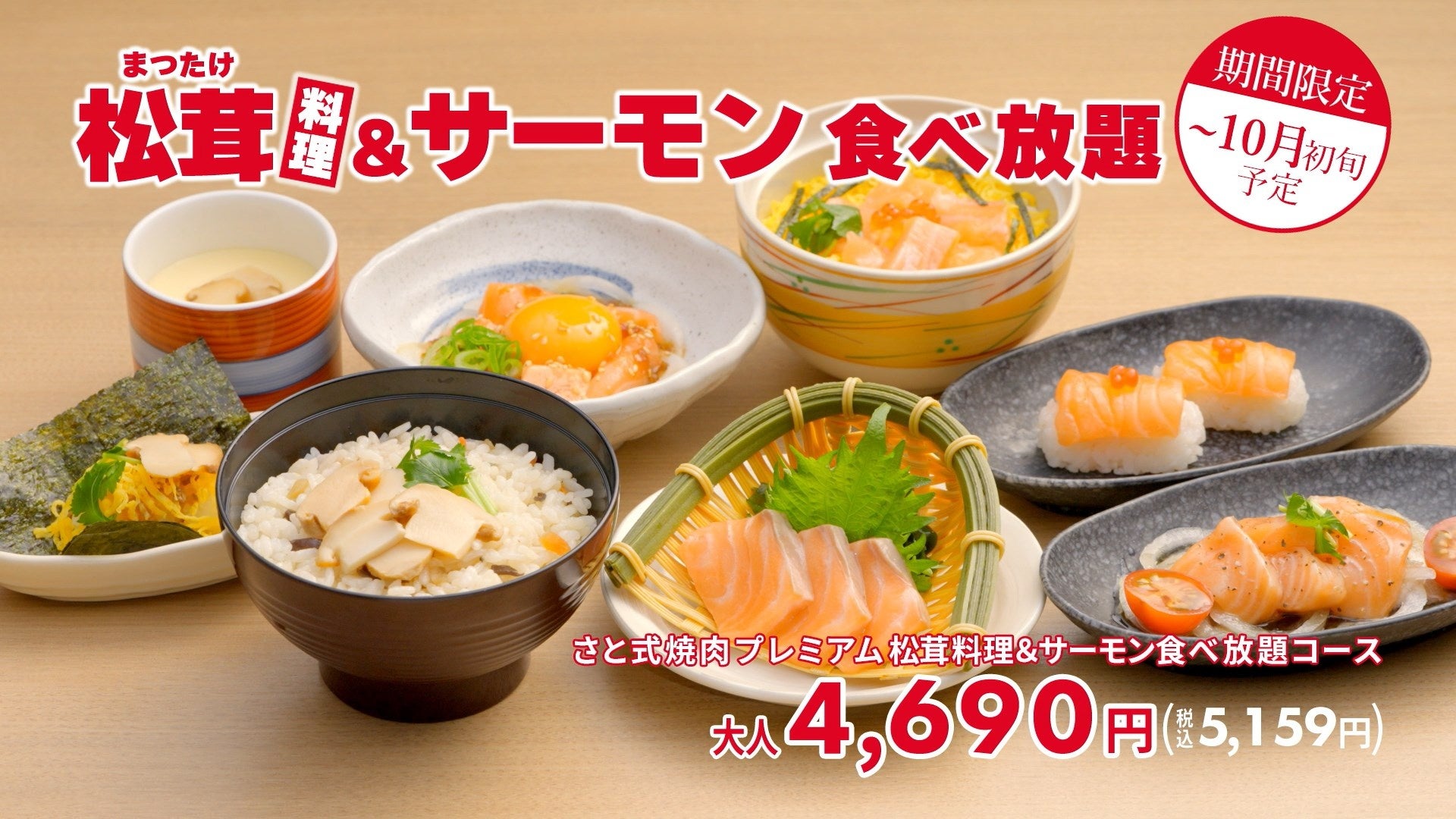 国内197店舗を展開する「和食さと」では、人気の3種類の食べ放題「しゃぶしゃぶ食べ放題:さとしゃぶ」、「すき焼き食べ放題:さとすき」、そして「焼肉食べ放題:さと式焼肉」で、秋を感じる『松茸料理&ノルウェーサーモン』が120分食べ放題の新コースを8月29日(木)から期間限定で販売!!