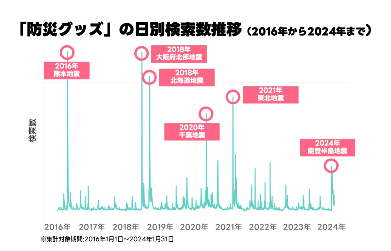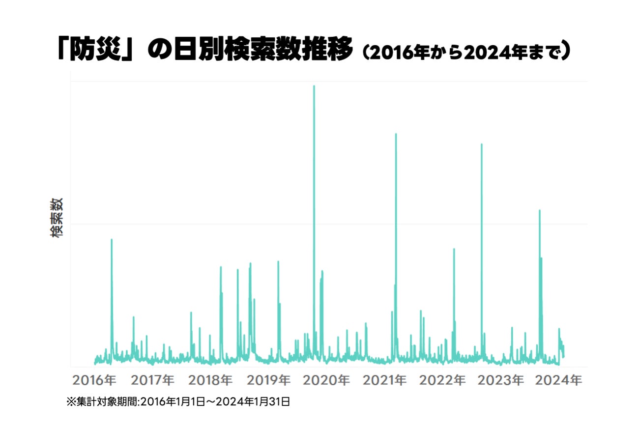 「Yahoo!検索」における2016年1月から2024年1月までの「防災」の検索数を分析したところ、下図のようにある日突然急増し、すぐに減少するという傾向がわかりました。