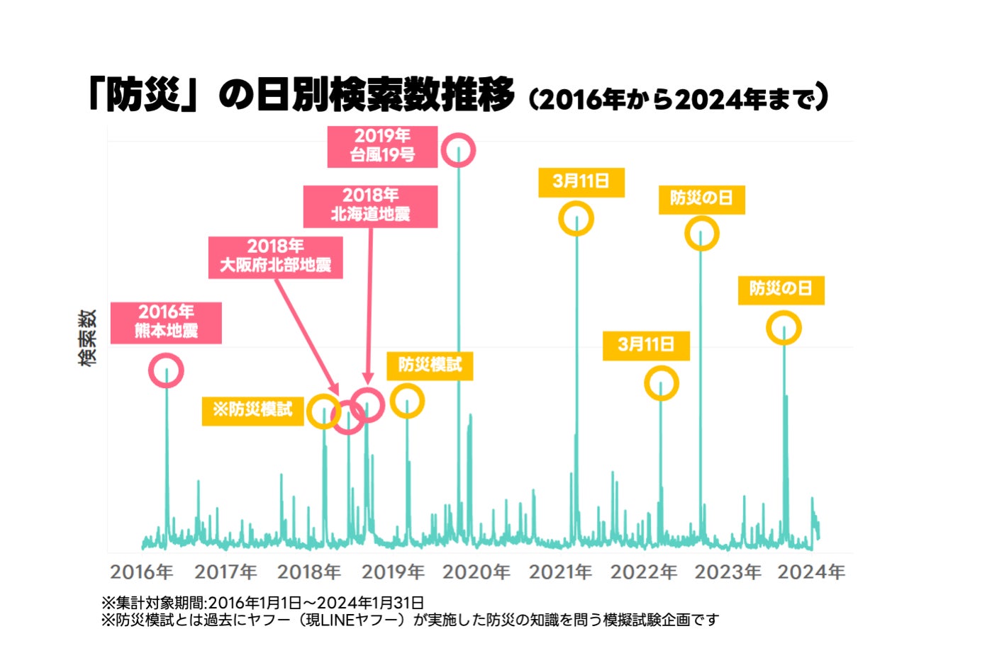 LINEヤフー株式会社(以下、LINEヤフー)が提供する、LINEヤフーの多様なサービスから得られる行動ビッグデータを分析できる事業者向けサービス「ヤフー・データソリューション」は、防災にまつわる検索行動を分析したレポート「『防災』を意識するときってどんな時? データで見る防災・減災」を公開しました。