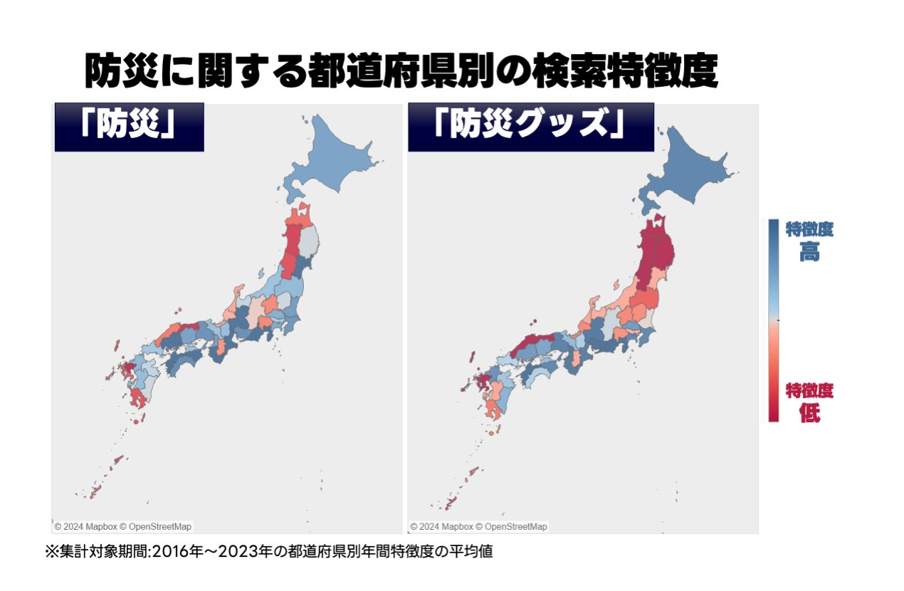都道府県別の検索特徴分布を見ても同様の傾向が見られました。2016年から2023年までの特徴度(※)を平均化して都道府県別の関心の高さを可視化してみると、「防災」「防災グッズ」ともに南海トラフ地震によって被害を受けると予想されている地域からの関心が高いことがわかりました。
