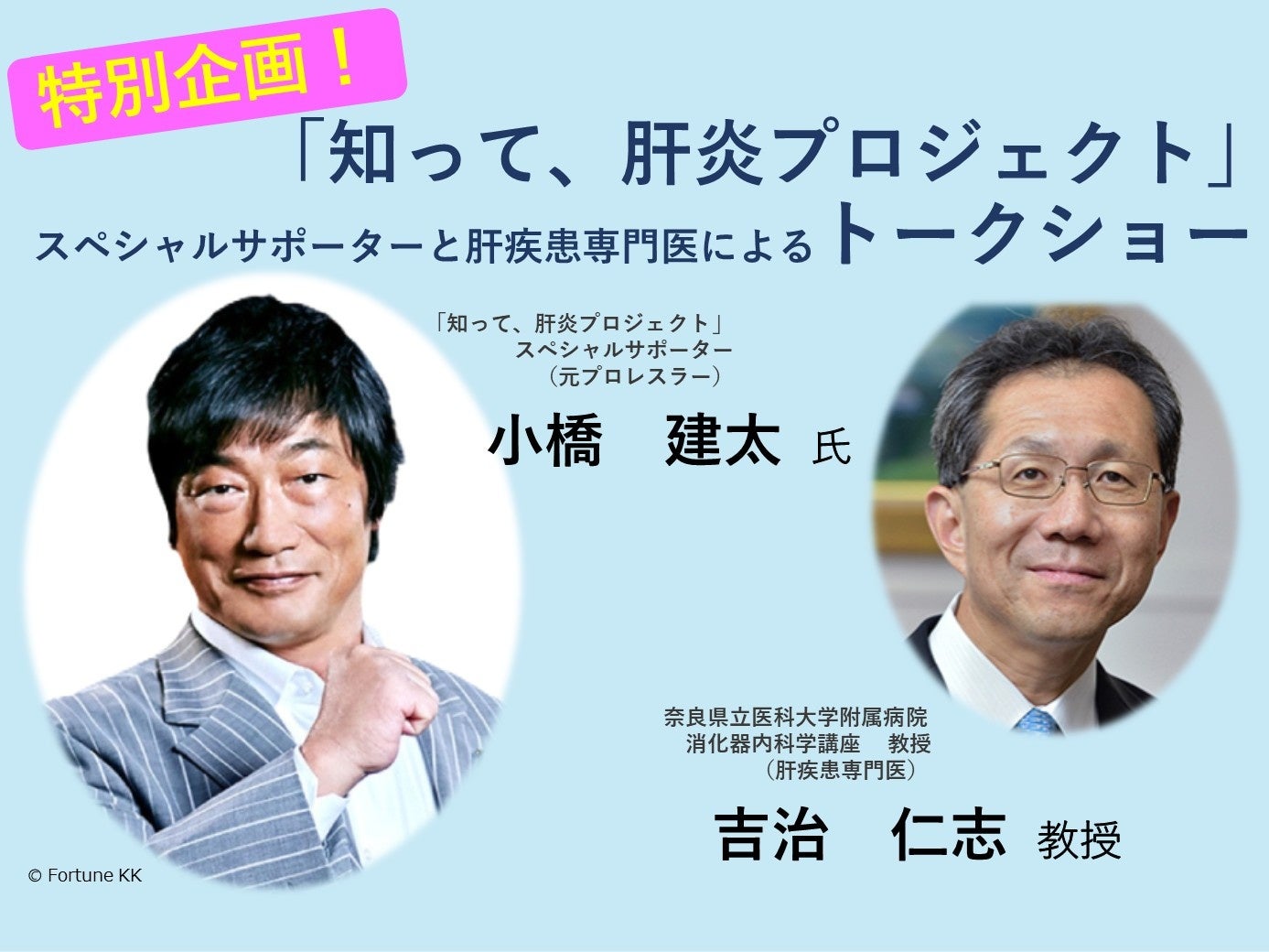 今年度の奈良県民会議は、厚生労働省の「知って、肝炎プロジェクト」との共催で実施します。スペシャルサポーターとして「絶対王者」小橋建太氏(元プロレスラー)が来県し、当日は小橋氏と肝疾患専門医の吉治仁志氏による特別トークショーを開催します。小橋氏は全日本プロレスおよびプロレスリング・ノアでご活躍された経験を持ち、現在「知って、肝炎プロジェクト」のスペシャルサポーターとして肝炎の啓発に取り組んでおられます。