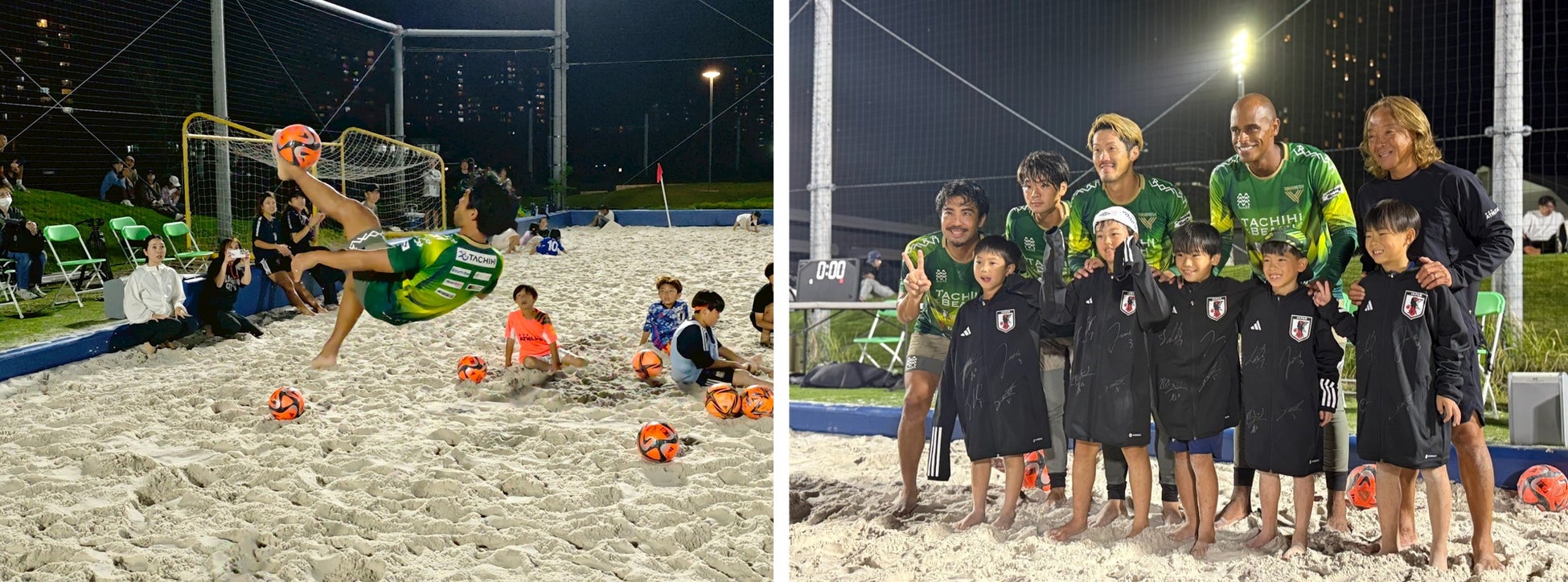 日本サッカー協会の今井さんによるビーチサッカーコンテンツはとても大盛り上がり。サッカーゴルフやコーン当ては通常の芝生の上だと簡単でも、砂の深さが50cmもあるビーチサッカーコートだと急に難易度が上がります。参加者たちは砂のデコボコや沈む砂に苦戦しながら楽しんでポイントを競っていました。イベントの最後はエキシビションマッチとして北澤さん、茂怜羅選手、上里選手、大場選手、田中選手の5名によるドリームチームと各チームが対戦。日本代表経験選手たちの技術力に完敗し、各チームがなかなか点数が入れられない中、参加した小学生全員による連合チームが点数を入れると大歓声が上がっていました。