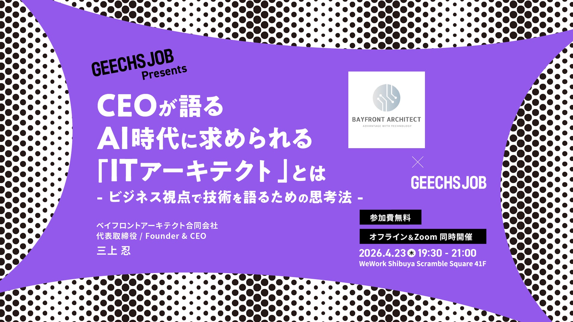 ギークスでは、ITエンジニア・ITエンジニア採用担当者を対象としたセミナーを定期的に実施しております。今回は「AI時代のITアーキテクト」をテーマに、ベイフロントアーキテクト合同会社CEO 三上 忍 氏にご登壇いただきます。AIの普及によりエンジニアの役割が再定義されるなかで、単なる実装スキルに留まらない「ビジネス視点を持った技術選定」や「CTO・経営層から選ばれるための思考法」について、スマートシティ等の大規模案件の実例を交えてお話しいただきます。