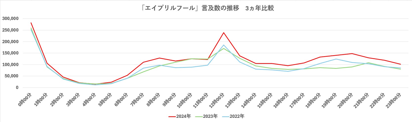 Xでは通常、朝・昼・夜の3つのタイミングで言及数が増える傾向があります。エイプリルフールに関しては、00:00と12:00の2回になり、少し特殊な盛り上がり方と言えます。