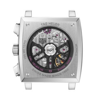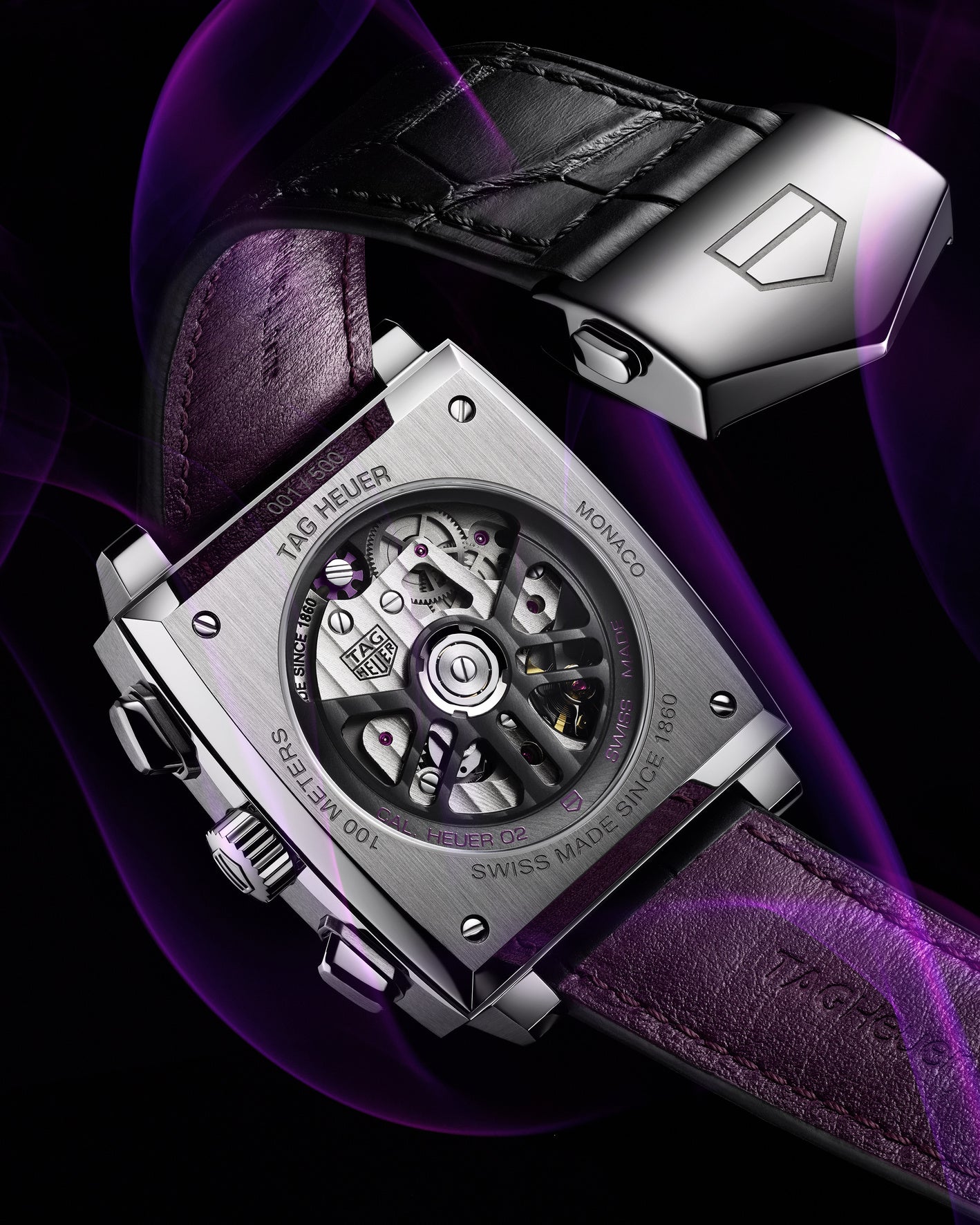 タグ・ホイヤーの自社製クロノグラフムーブメント、キャリバー ホイヤー02の特徴である独自デザインのローター、コラムホイール、表面に施されたコート・ド・ジュネーブ装飾が、サファイアケースバック越しに鑑賞できます。また、高級時計の証であるコラムホイールにパープルのカラーリングを施しました。このムーブメントは、約80時間のパワーリザーブを含む優れた計時性能を備えています。さらに特別なタッチとして、ブラックのアリゲーターストラップにパープルの裏地を採用し、ケースバックには作品番号のXXX/500が刻印されています。