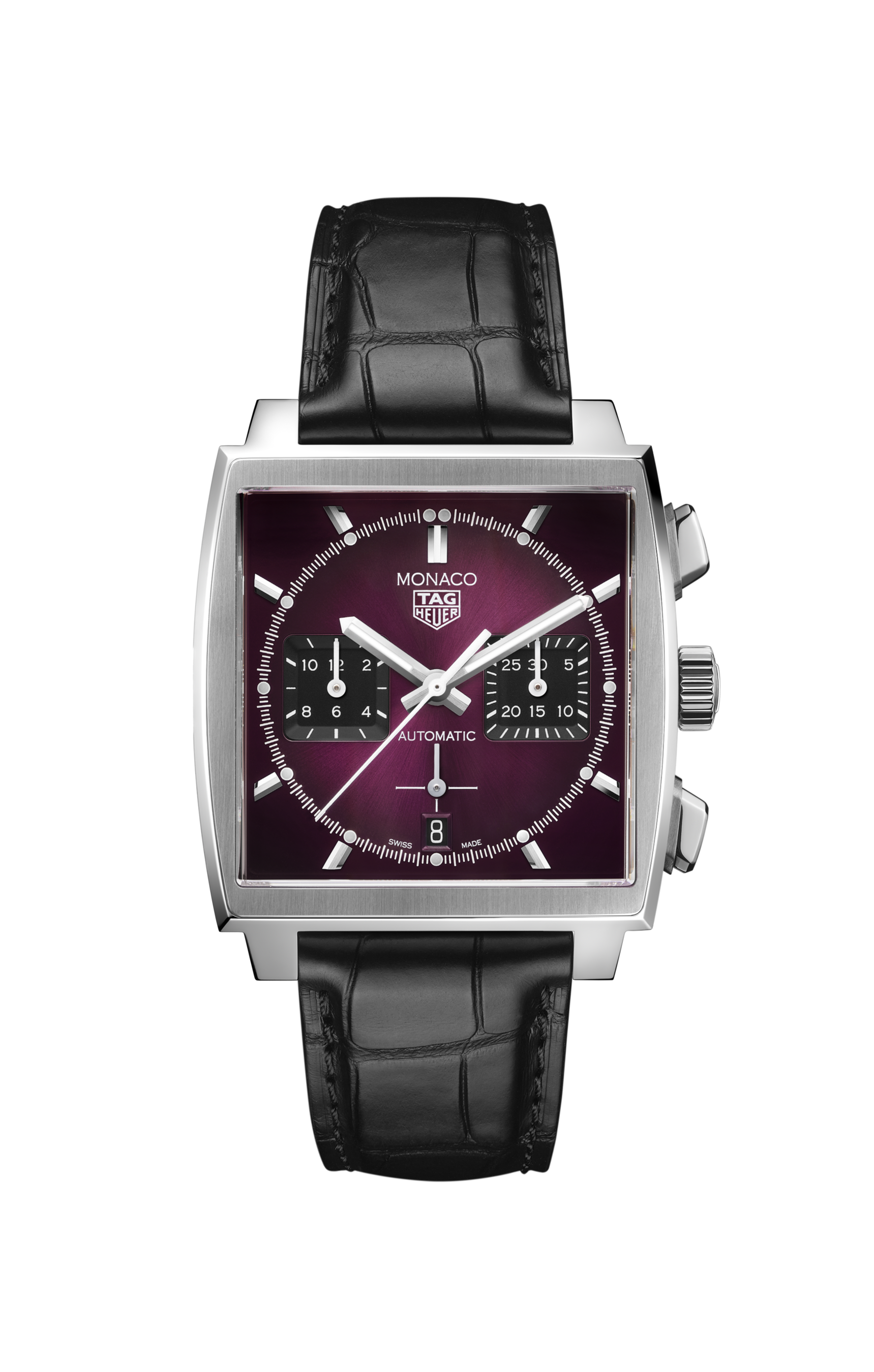 キャリバー ホイヤー02 / 自動巻き/ パープル サンレイ&スモークブラッシュ仕上げのダイヤル/ ロジウム加工のアプライドインデックス/ ケースサイズ 39mm x 39mm/ ステンレススティール製ケース/ ブラックアリゲーターレザーストラップ