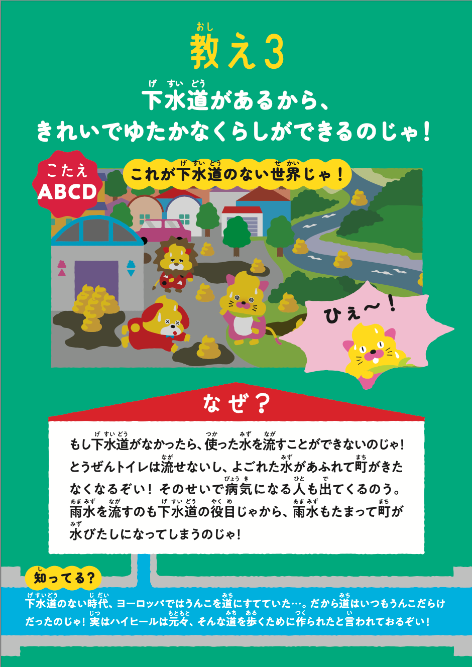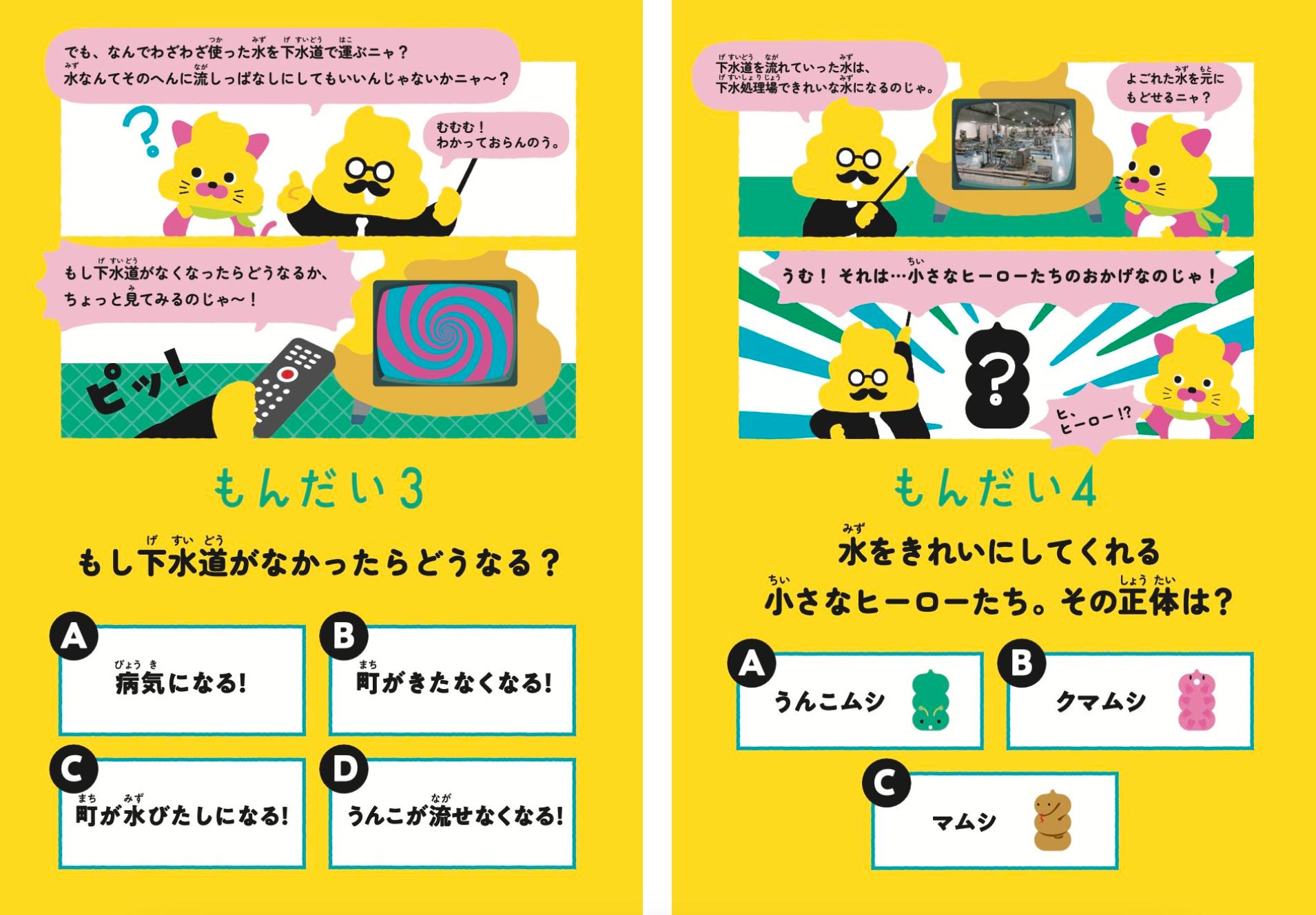 親しみやすく可愛らしいイラストとテンポよく展開されるストーリーで子どもの興味を惹きつけながら、クイズを通じて下水道の役割や重要性、処理された水がどのように環境に戻されるのかなどを学ぶことができます。