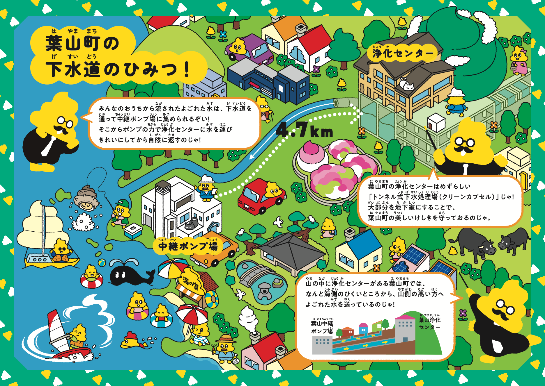 さらに、冊子の巻末には、葉山町の下水道のひみつにせまるイラストが。低いところから高い方へ汚れた水を運んでいることや浄化センターの大部分が地下室になっていて葉山町の美しい景観を守っていることなど葉山町の下水処理の工夫について学ぶことができます。