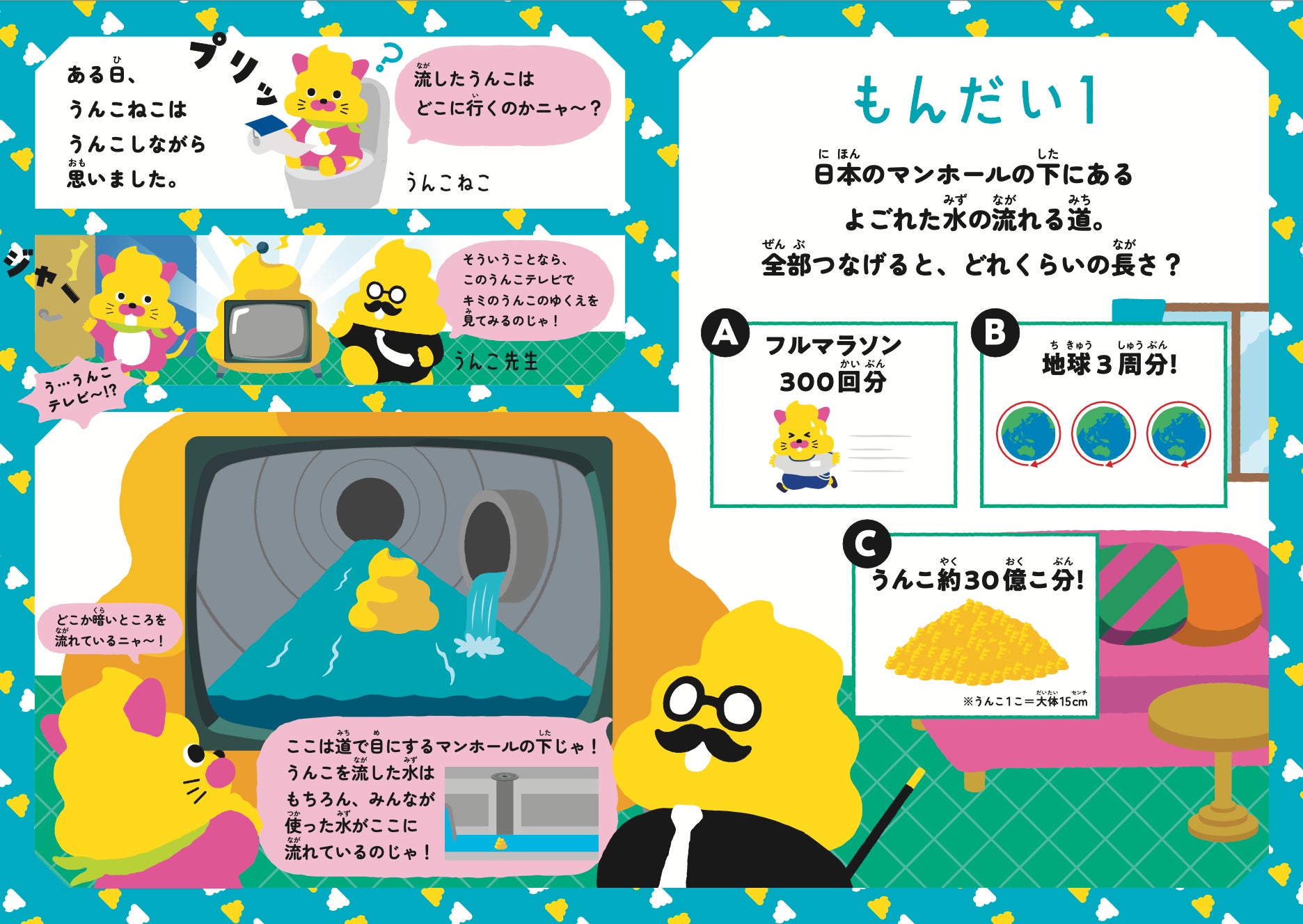 冊子は、流したうんこの行方が気になったうんこねこが、うんこドリルの人気キャラクター・うんこ先生と下水道に流れるうんこを観察するところから始まります。