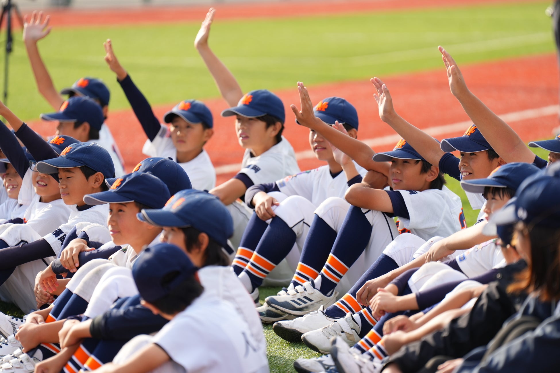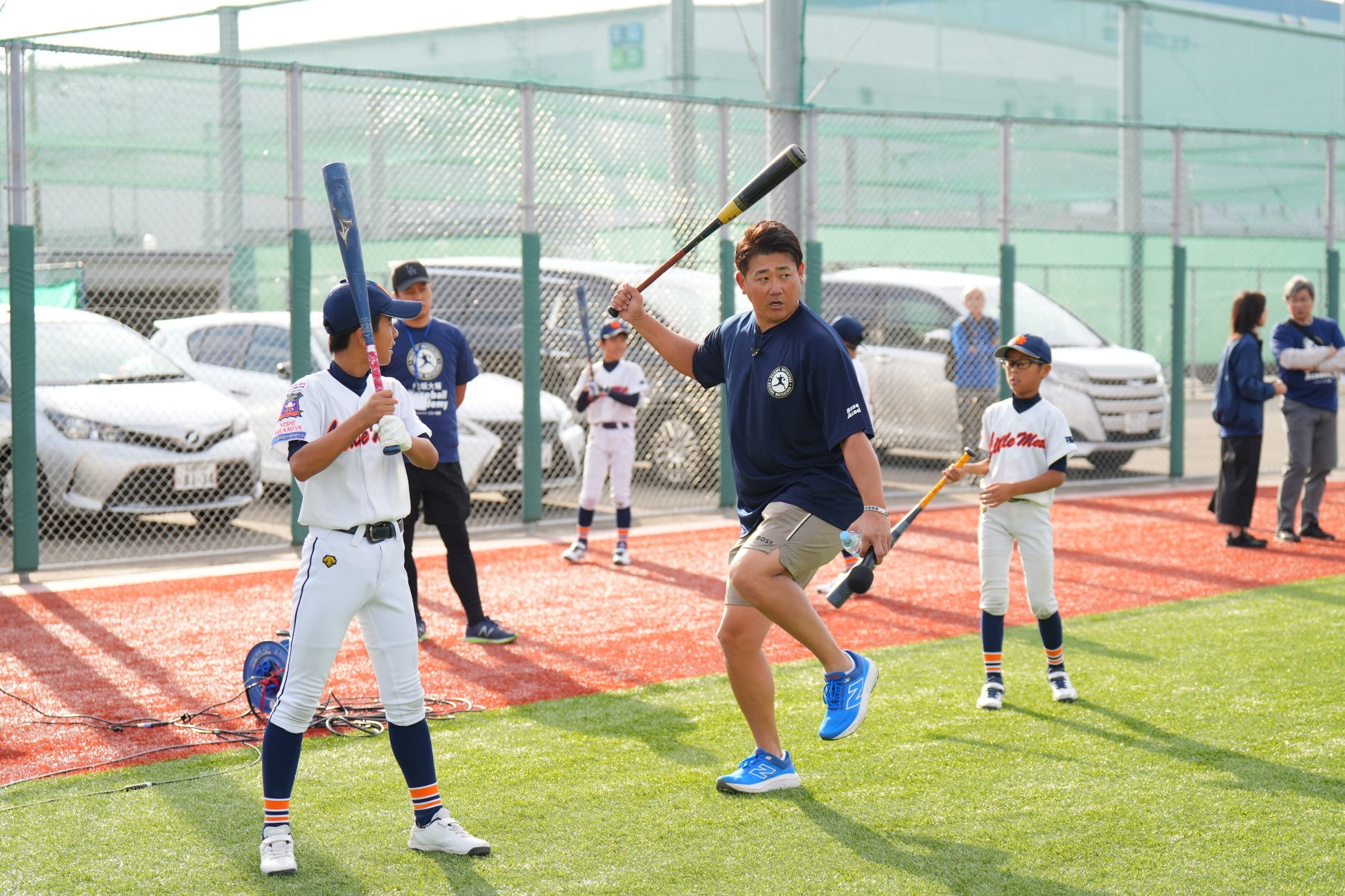 最後に行われたバッティング指導では、松坂さんが打撃の基本やポイントを分かりやすく解説。松坂さんによるバッティングのデモンストレーションも行われ、子どもたちは目を輝かせ、アドバイスに真剣に耳を傾けながら、次々とバッティングを実践しました。指導を受けた子どもたちは「難しかったけど松坂さんから直接教えてもらえて嬉しかった」「これからもっと野球を頑張りたい」と興奮気味にコメント。チーム全員が汗をかきながらも達成感に満ちた表情になり、温かい雰囲気の中で野球教室が終わりました。