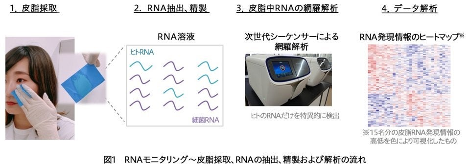 「皮脂RNAモニタリング」は、あぶらとりフィルムで顔の皮脂を採取し、その皮脂からRNAを抽出して網羅的に分析する花王独自の解析技術です(図1)。DNAが、その人固有の一生変化しない情報であるのに対し、RNAは、体調や食生活、運動、ストレス、紫外線といった環境要因によって日々変化するため、その時々の肌や体の状態を知るのに有用であると言えます。