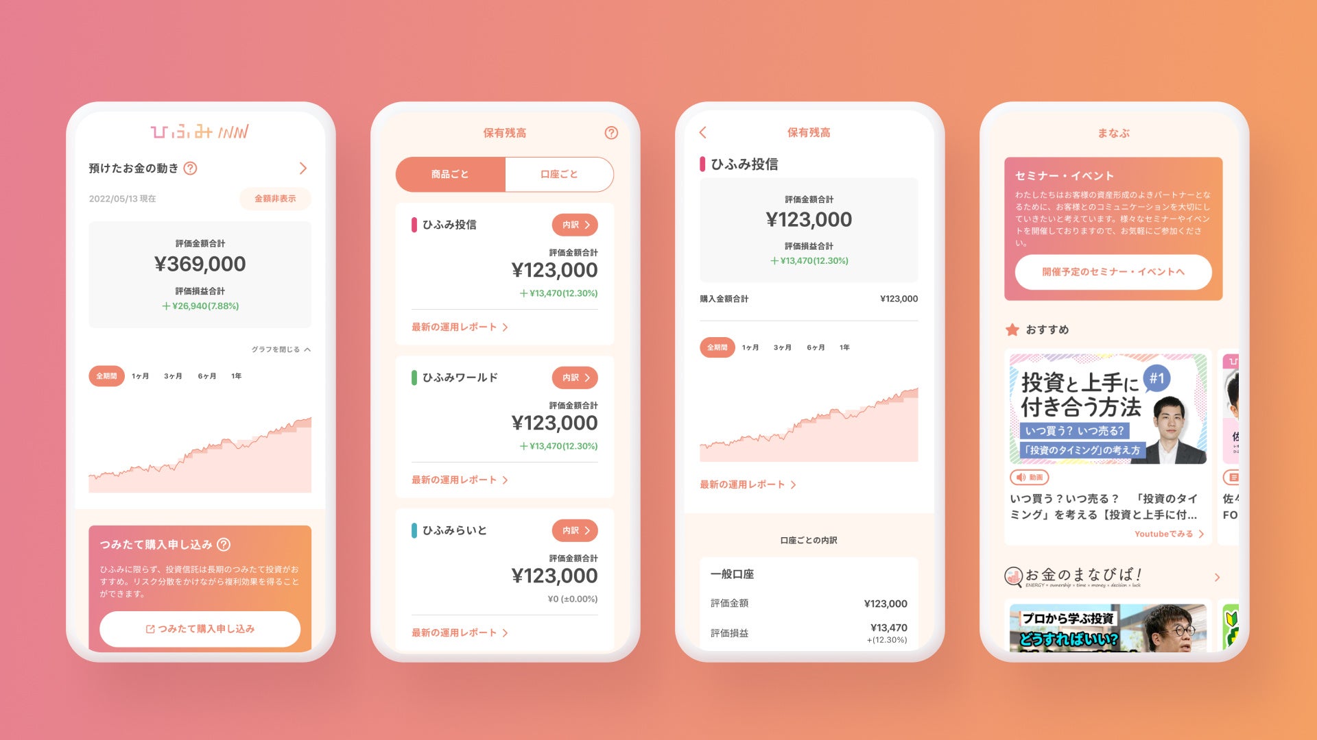 スマホが幅広い年代に浸透し生活インフラとして定着する中、お客様とのタッチポイントとしてスマホアプリを提供・運営することで、「ひふみ」シリーズの魅力や運用状況だけでなく、長期投資の重要性や投資がもたらすワクワクや学び、社会への貢献といったさまざまな価値をより多くのお客様にお届けしようとアプリの開発に至りました。
