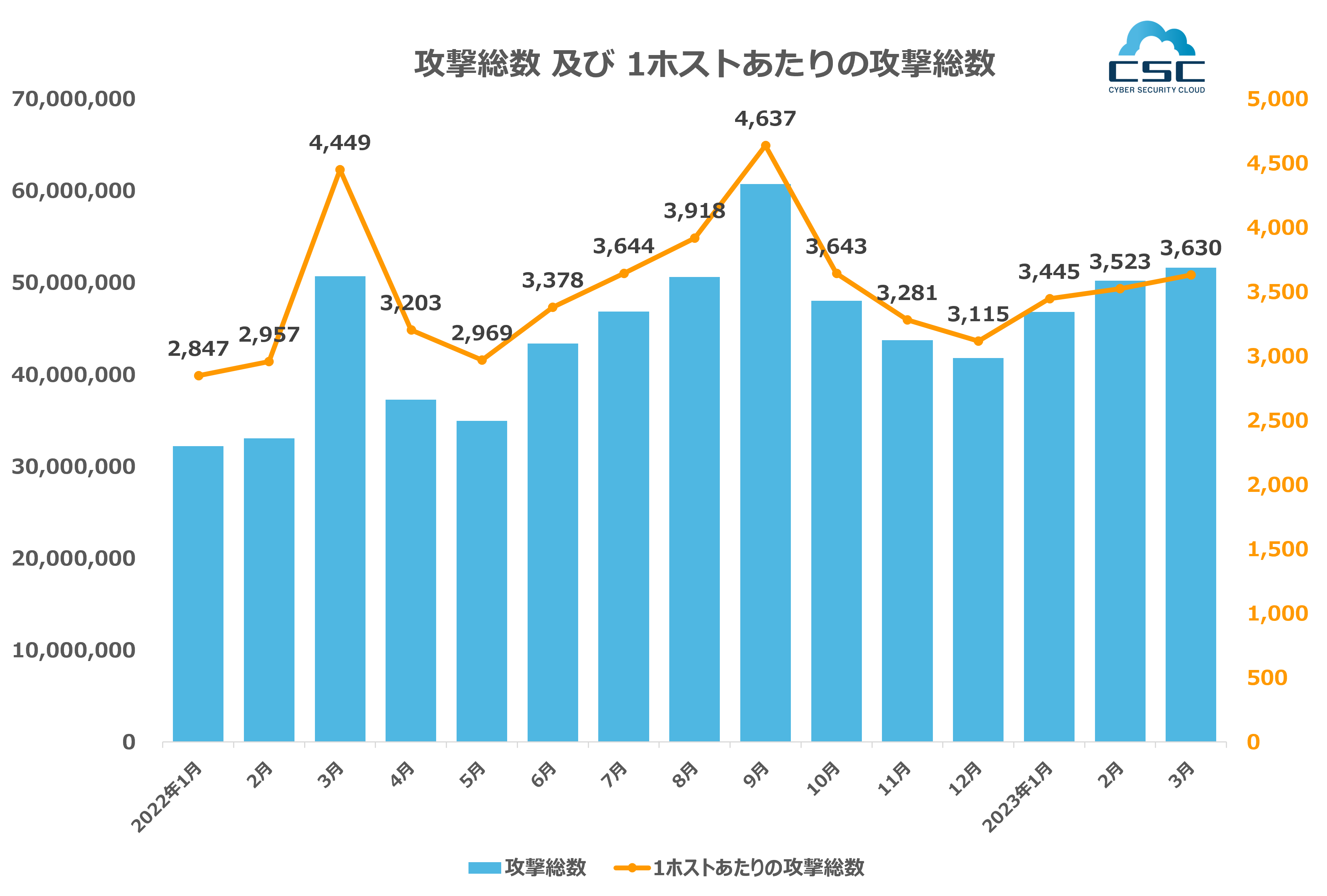 2023年1月1日から3月31日までに、当社で検知したWebアプリケーションへのサイバー攻撃の総数は148,631,502件となり、1ホストあたり(※)では10,598件でした。