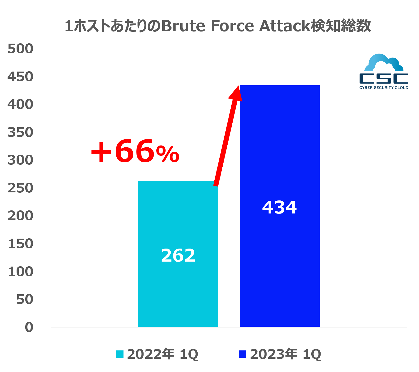 2022年1月〜3月とで比較すると、2023年1月〜3月のブルートフォースアタックの攻撃総数は2,950,044件から6,074,706件とおよそ+206%(約312万件)増加していることが分かりました。1ホストあたりでは、262件から434件と前年同期比でおよそ+66%増加していました。