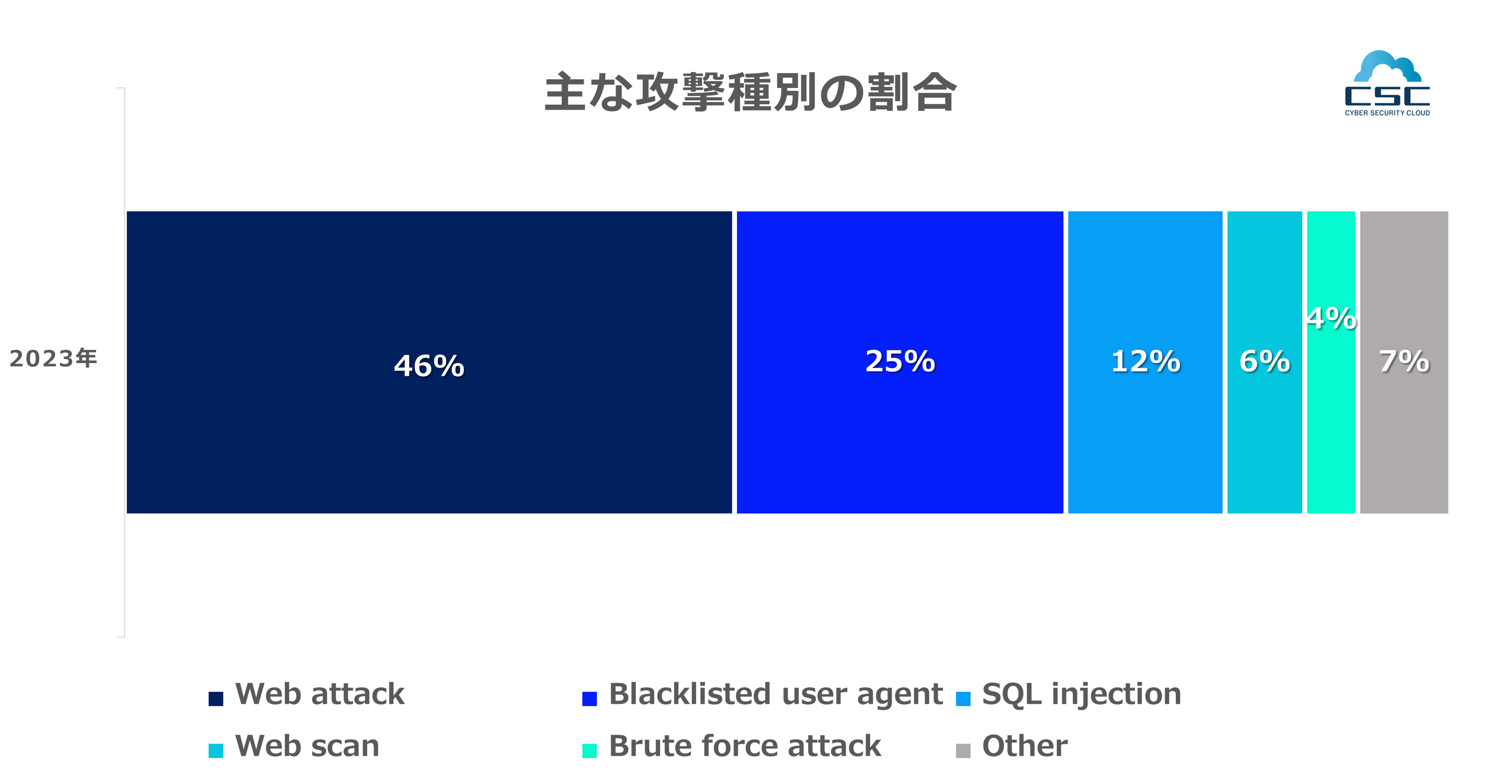 当社が検知したサイバー攻撃を攻撃種別ごとに分類すると、2023年1月〜3月はWebサーバを構成するソフトウェアの脆弱性に対する攻撃である「Web attack」がおよそ6,900万件と全体の46%を占めています。次いで、脆弱性スキャンツールなどを利用したBotによる攻撃である「Blacklisted user agent」がおよそ3,700万件で25%に。また、システムの脆弱性を意図的に狙い、想定しないSQL文を実行させ、データベースシステムを不正に操作する「SQLインジェクション」が、およそ1,700万件で12%でした。