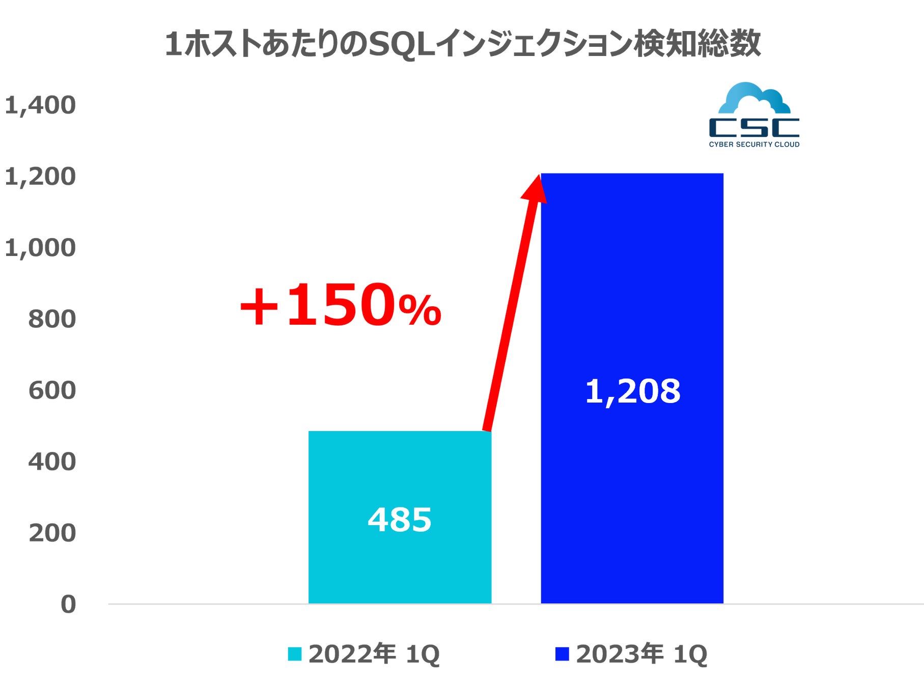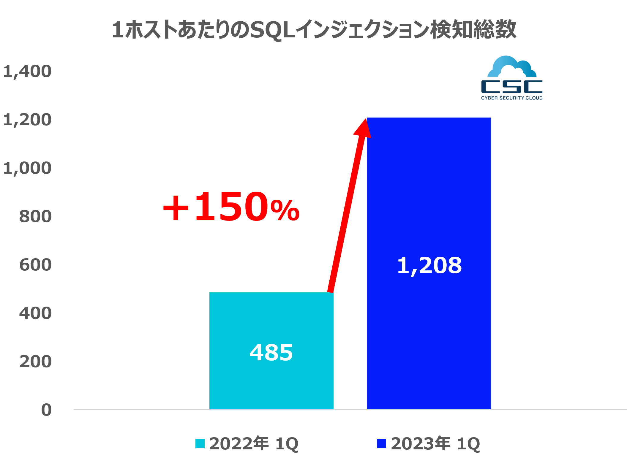 2022年1月〜3月とで比較すると、2023年1月〜3月のSQLインジェクションの攻撃総数は5,481,900件から16,985,151件とおよそ+210%(約1,150万件)増加していることが分かりました。1ホストあたりでは、485件から1,208件と前年同期比でおよそ+150%増加していました。
