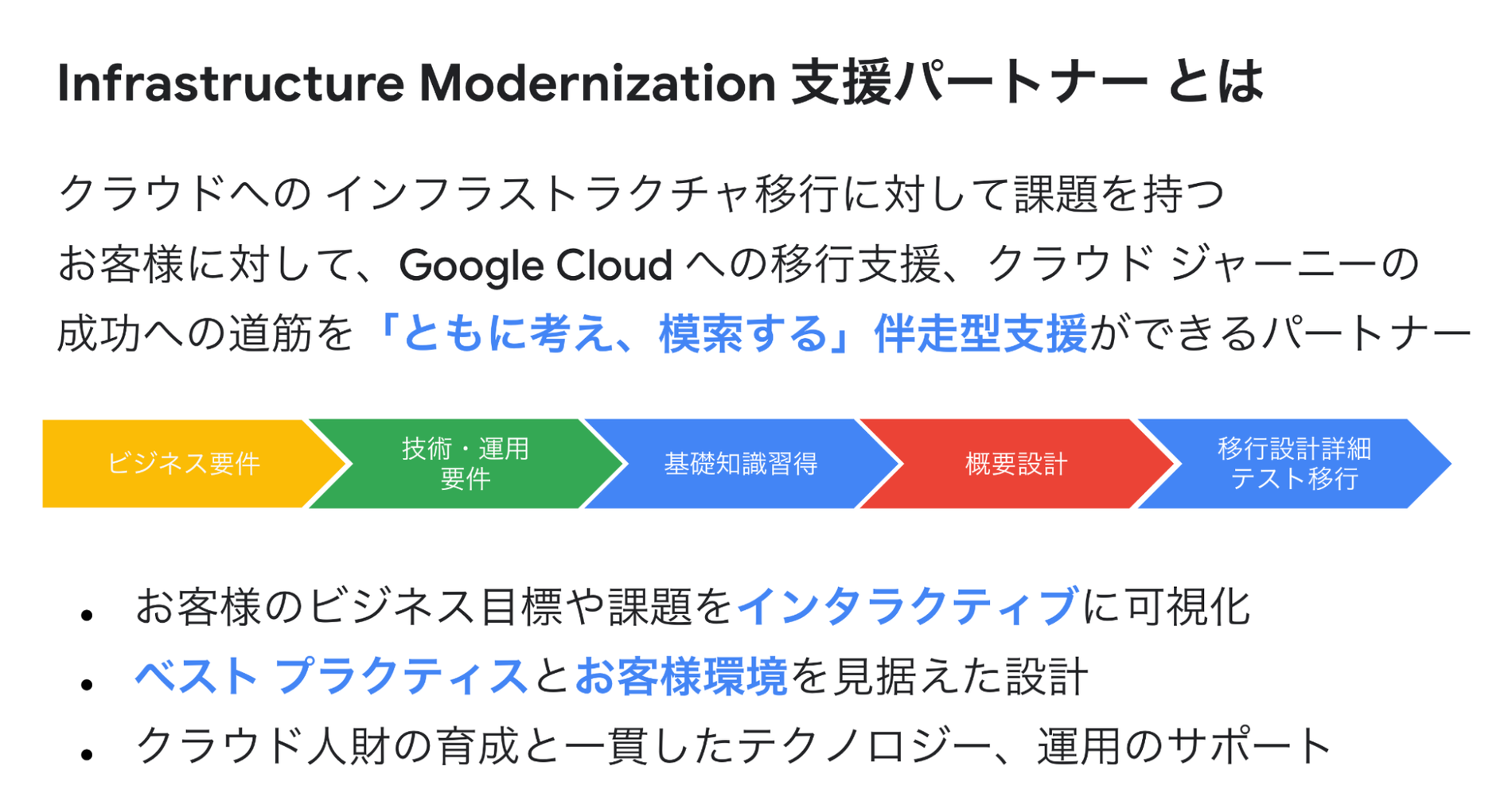 Infrastructure Modernization 支援パートナーとは、クラウドへのインフラストラクチャ移行(Lift & Transform)に対して課題をもつお客様に対して、Google Cloud への移行支援、クラウドジャーニーの成功への道筋を「ともに考え、模索する」伴走型支援ができるパートナーです。