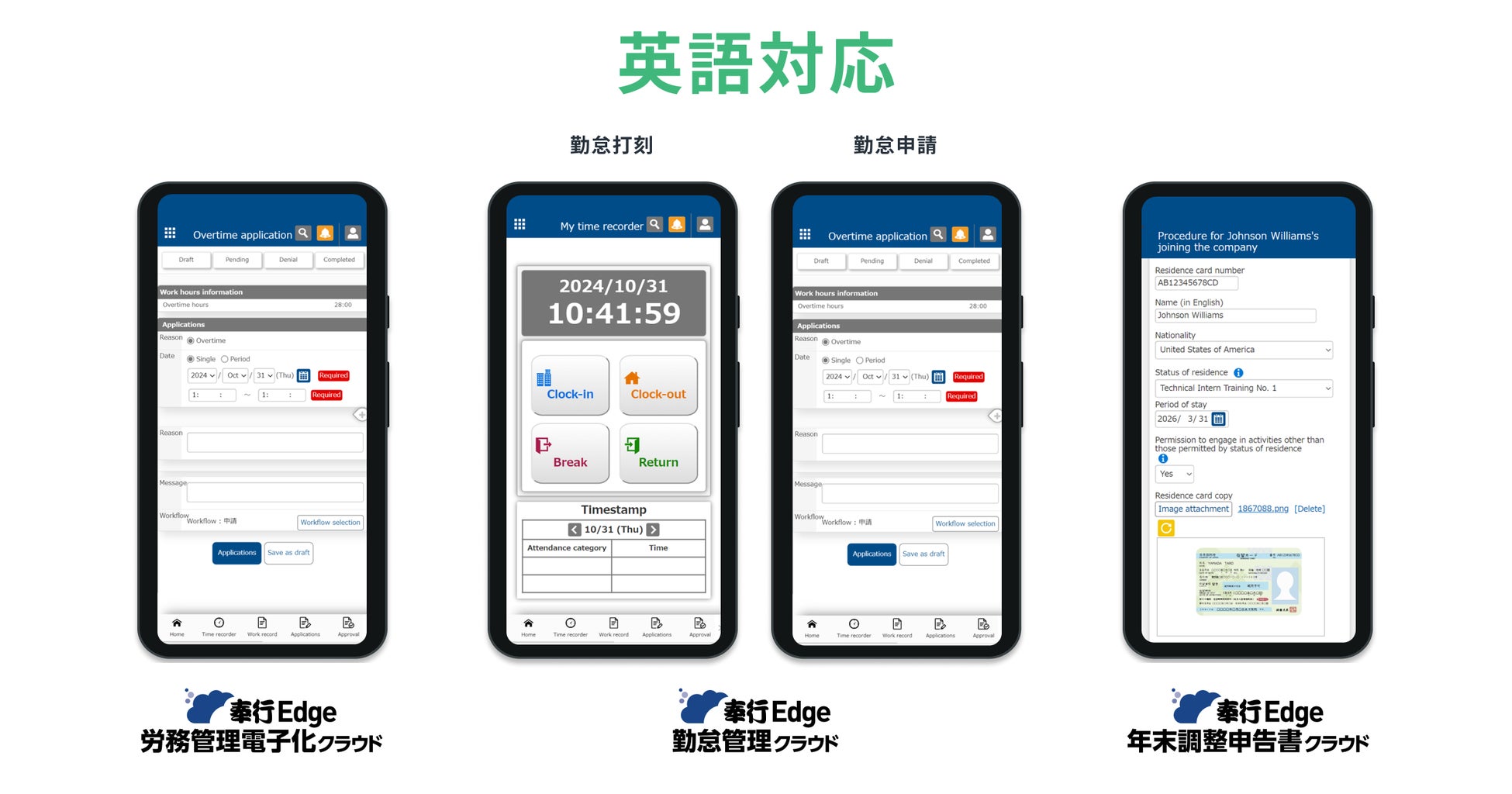 OBC が提供する『奉行Edge 労務管理電子化クラウド』『奉行Edge 勤怠管理クラウド』『奉行Edge 年末調整申告書クラウド』の従業員利用画面を、WOVN.io で英語対応しています。