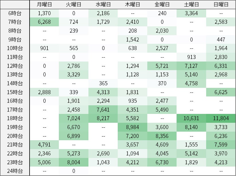 CMが放映された曜日・時間帯別を見てみると、平日・休日を問わず、18時以降の検索効率が高いことが分かります。この時間帯は仕事終わりにTVを視聴している層が多く、リラックスや休みに意識が向くことが多い傾向にあります。