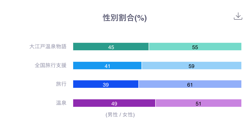 上図は各キーワードを検索した性別割合です。大江戸温泉物語のブランド名や旅行、温泉などのカテゴリ検索においては女性が50%以上を占めていることが分かります。今回のCMでは出演が女性のみであり、ターゲット層であるF1層が当事者意識を持ちやすかったと考えられます。