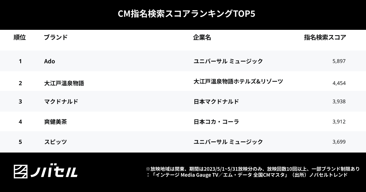 2023年5月1日~5月31日までに放送されたテレビCMのうち、指名検索スコアが高かった上位5位までのランキングです。