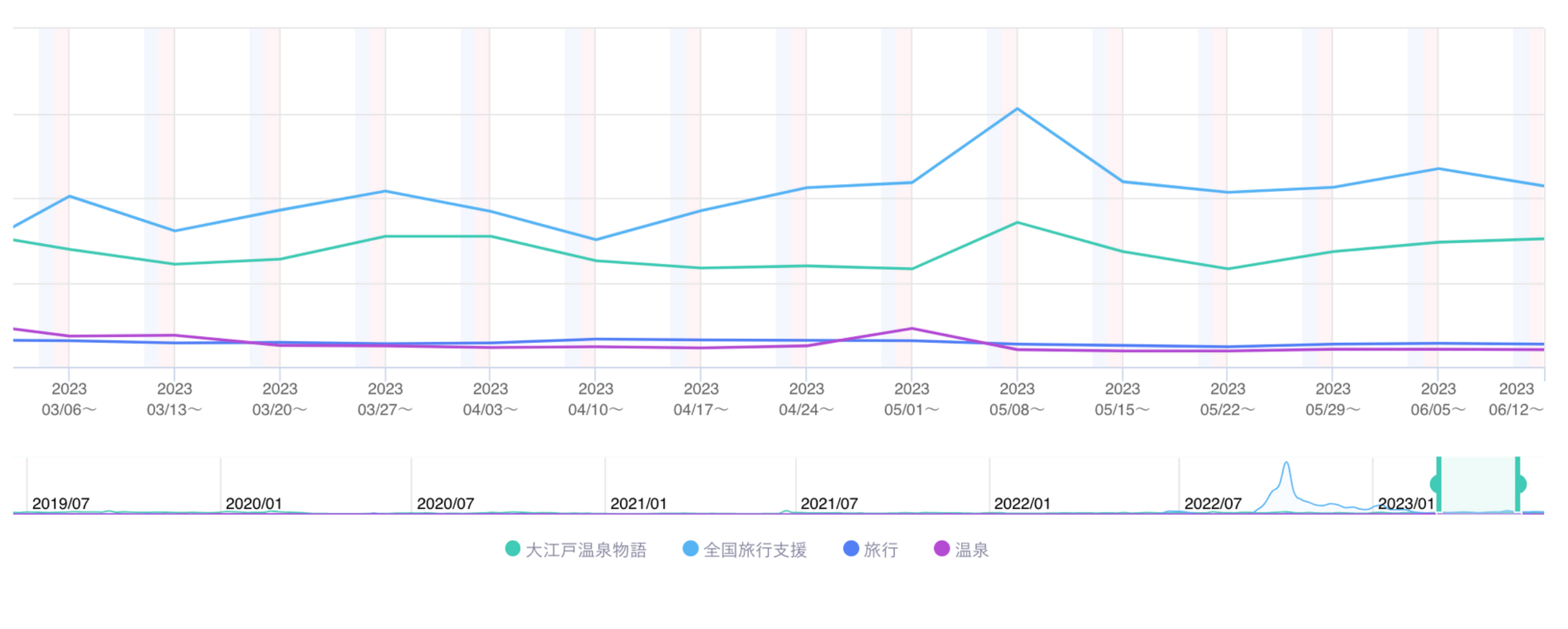 実際に2023年5月からの検索推移をみてみると、「全国旅行支援」と「大江戸温泉物語」は類似の推移が確認できます。「全国旅行支援」という、旅行の際に想起されやすいワードに近い要素をクリエイティブに挿入していたことが、指名検索スコアに寄与したと考えられます。
