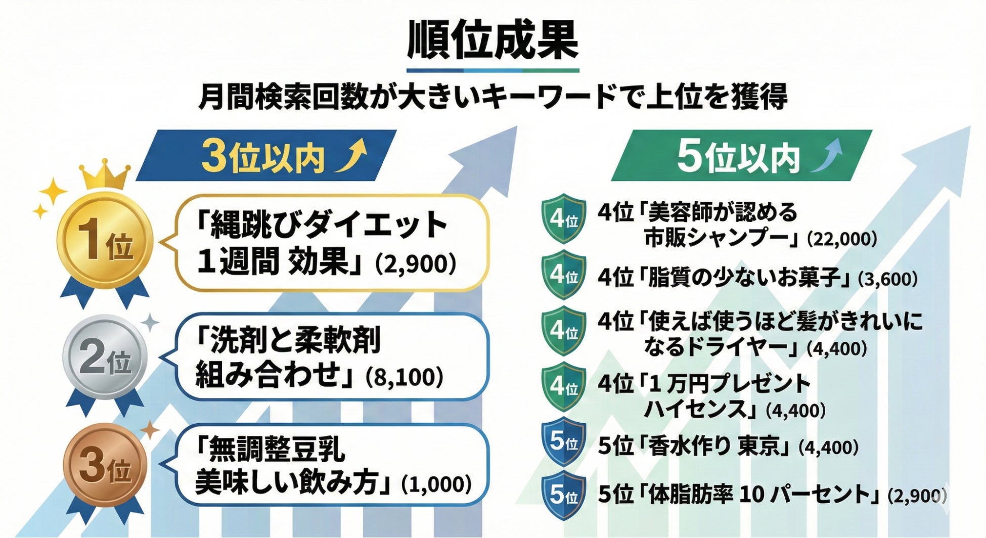 主要キーワードでの成果:「美容師が認める 市販シャンプー」「洗剤と柔軟剤 組み合わせ」といった、競合の多い主要キーワードにおいて検索順位トップ5入りを達成。