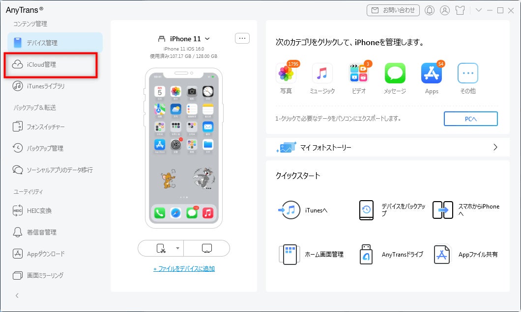 Step1.パソコンでAnytransをダウンロードして起動します。USBケーブルでiPhoneをパソコンを繋ぎます。ホーム画面で「iCloud管理」を選びます。