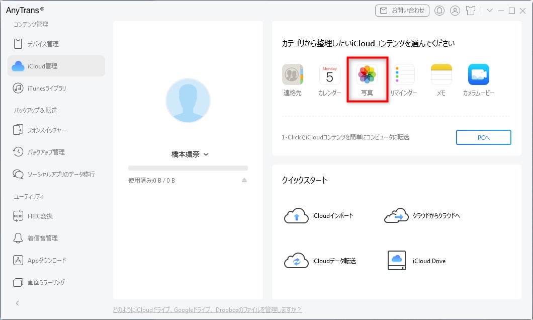AnyTransはiOSデバイス向けの専門的なデータ移行ソフトです。このソフトで、iCloudにデータをアップロードだけでなく、iCloudのデータをダウンロード・削除もできます。では手順を説明します。