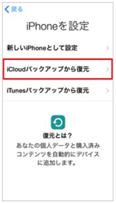 Step1.Apple IDを新しくログインして、改めて設定が始まります。「iCloudバックアップから復元」をタップします。