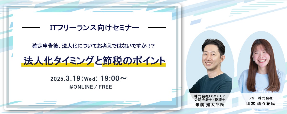 ITエンジニアの新しい働き方を提案する株式会社PE-BANK(東京都港区/代表取締役 髙田 幹也)は、2025年3月19日(水)19時より、ITフリーランスのためのオンラインセミナー、 『法人化タイミングと節税のポイント』を開催いたします。本ウェビナーはITフリーランス向け福利厚生サービス「サポートプラス」が主催するウェビナーで、今回で59回目の開催となります。