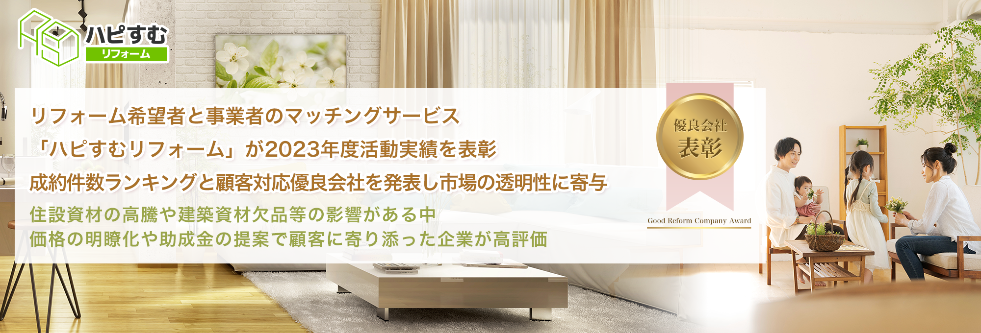 リフォーム希望者と事業者のマッチングサービス「ハピすむリフォーム」が2023年度活動実績を表彰。成約件数ランキングと顧客対応優良会社を発表し市場の透明性に寄与