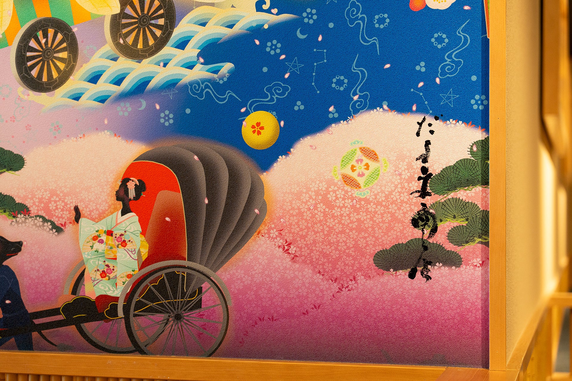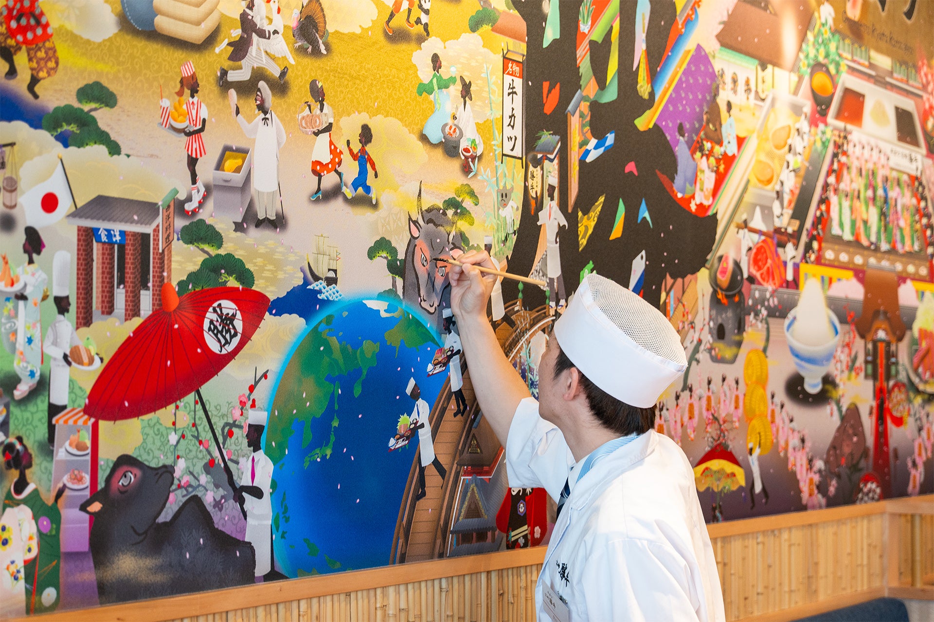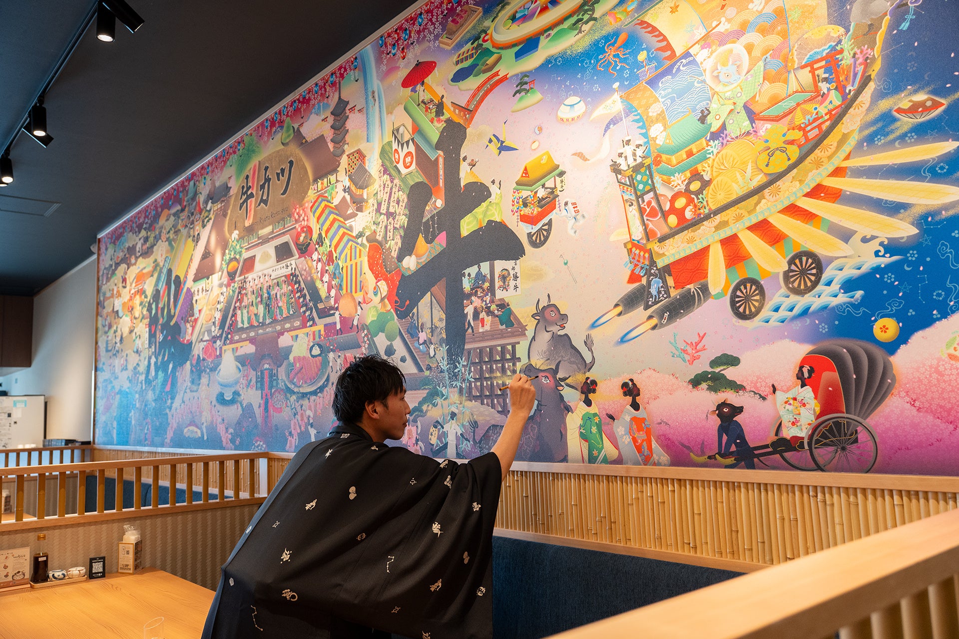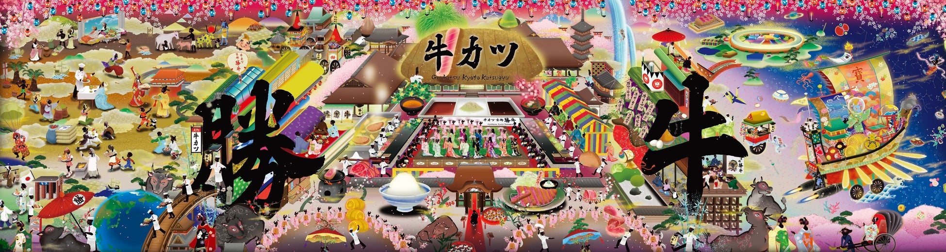 今回、京都発の絵描きユニット「だるま商店」と約9年ぶりに再びタッグを組み「牛カツ京都勝牛 大阪・関西万博店」のキービジュアルを制作しました。完成したビジュアルは、幅6メートルを超える迫力の壁面アートとして店内に大きく掲出しています。